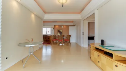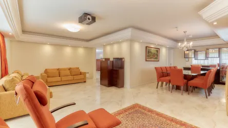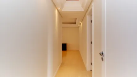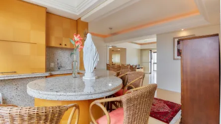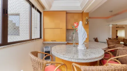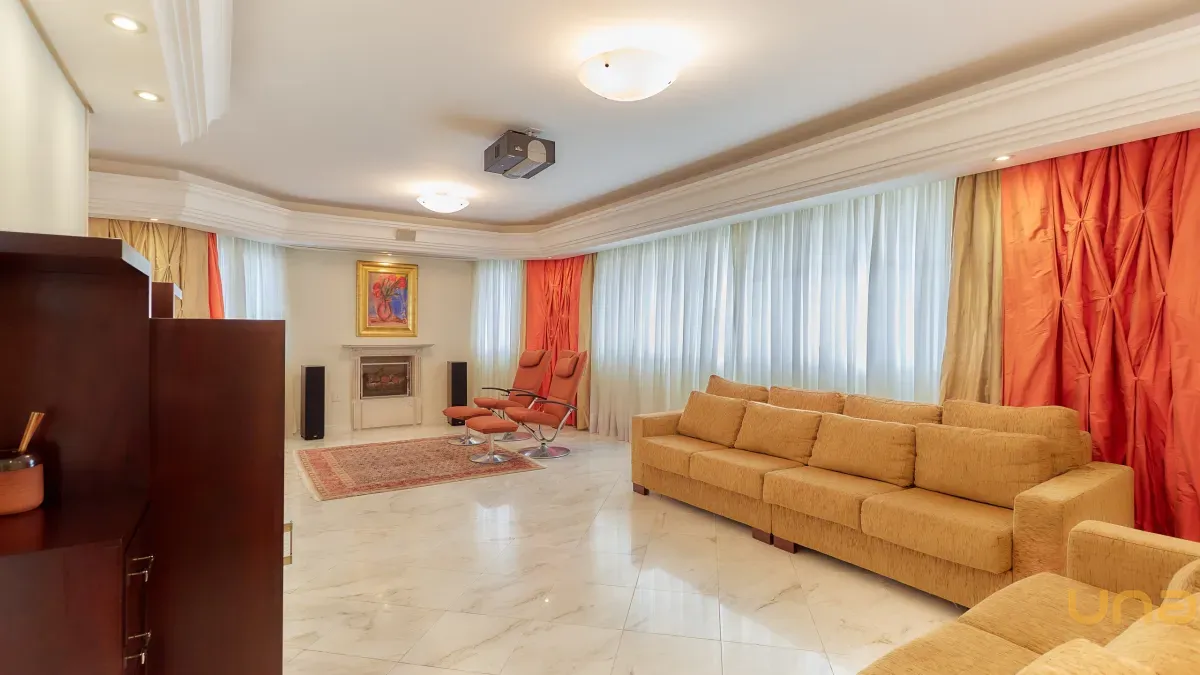 Ao entrar, você é recebido por uma sala espaçosa com piso em mármore, ideal para acomodar 3 ambientes distintos. O projeto de iluminação moderno realça o charme do espaço, que também conta com uma lareira, perfeita para os dias frios. Integrada à sala íntima, a área gourmet é um destaque especial, com churrasqueira à carvão, bancada em granito e uma sacada envidraçada, proporcionando um ambiente acolhedor e funcional para momentos de lazer com familiares e amigos.