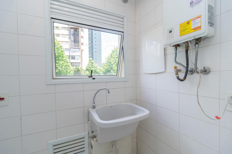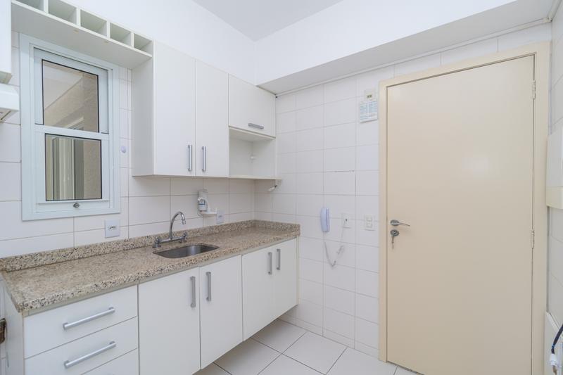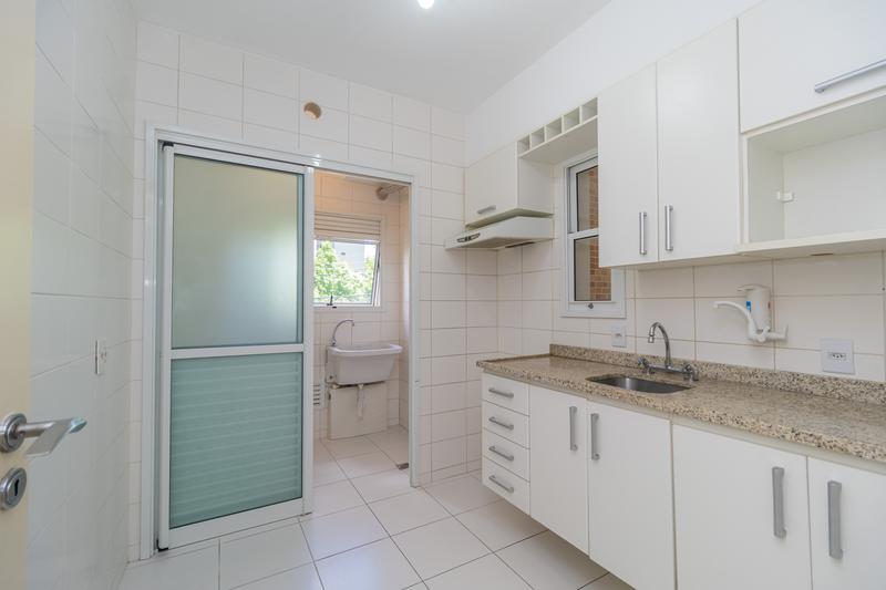 – Cozinha com armários e lavanderia com tanque.