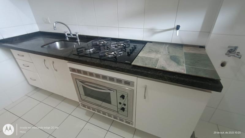 Cozinha planejada, equipada com armários, pia e balcão com tampo em granito, cooktop e forno elétrico, unindo praticidade e estilo.
