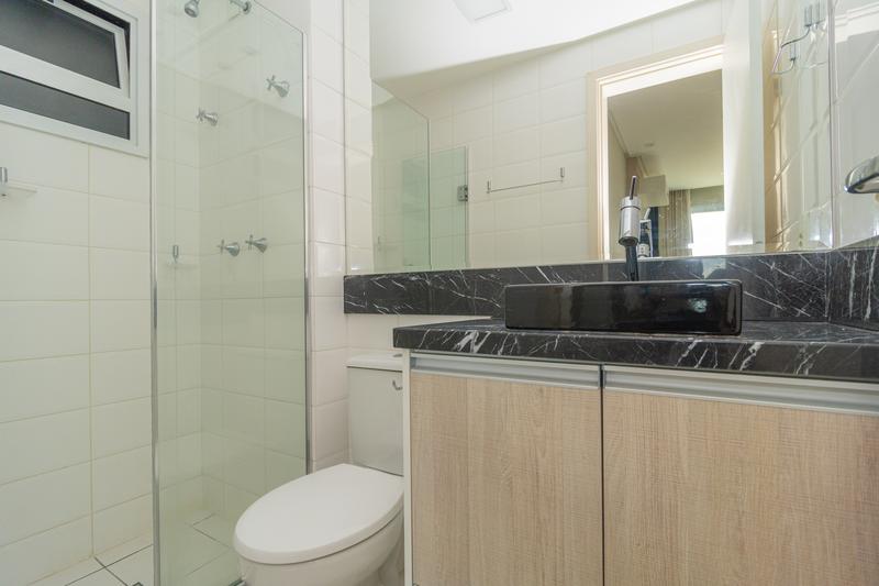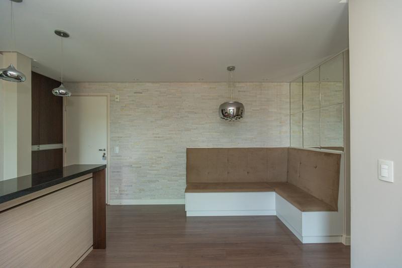 – Sala para 2 ambientes, possui um canto alemão, espelho na parede, rack e painel para TV, acesso para varanda com churrasqueira, armário, pia e fechamento em vidro com sistema reiki,