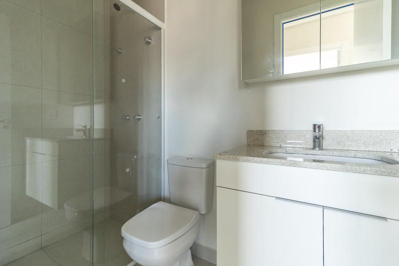 02 Banheiros com armário planejado, espelho, box e ducha, trazendo comodidade e um visual moderno ao dia a dia.
