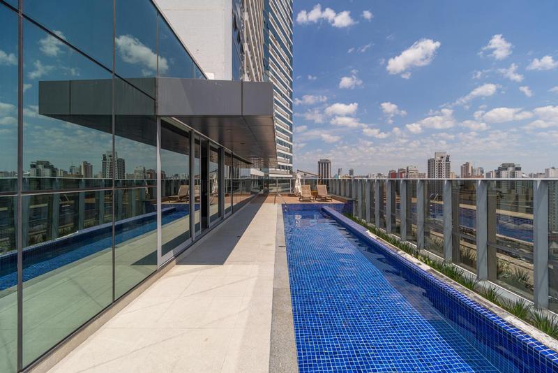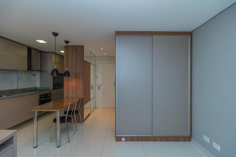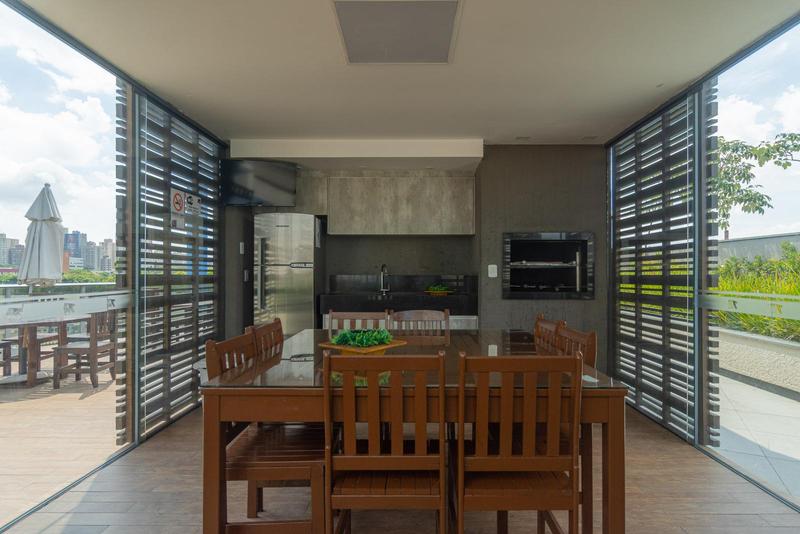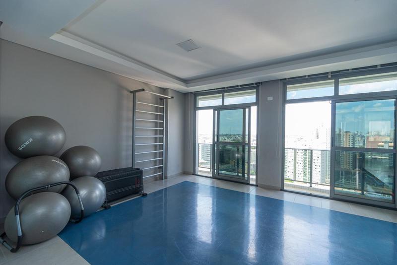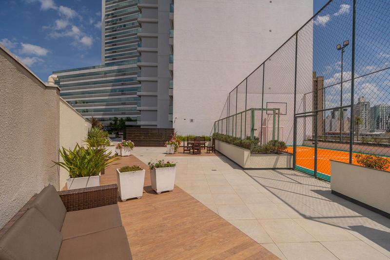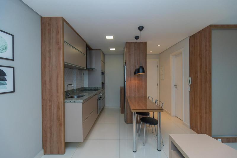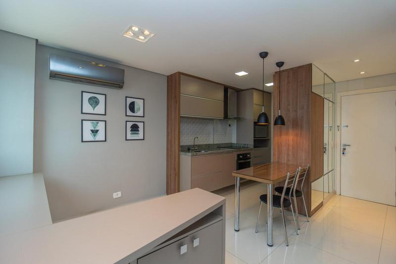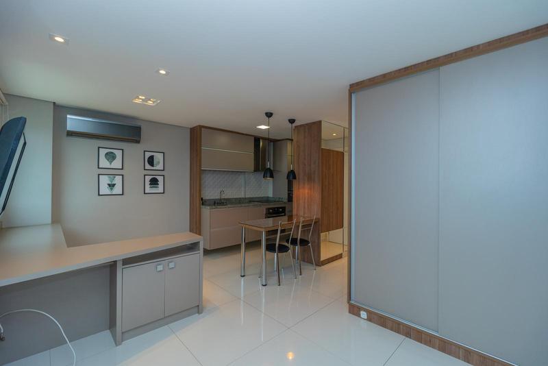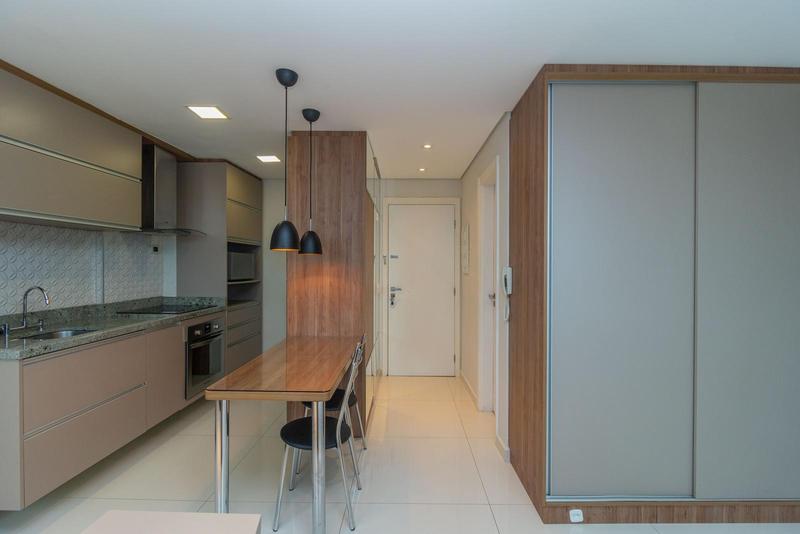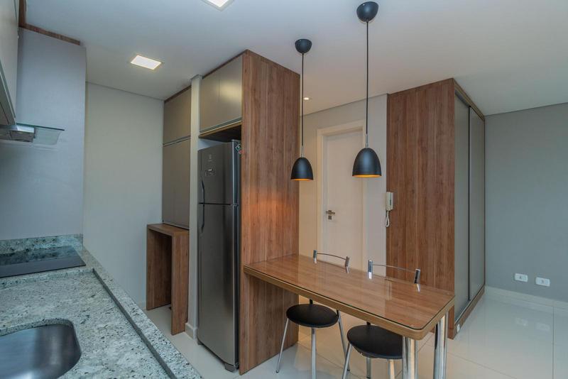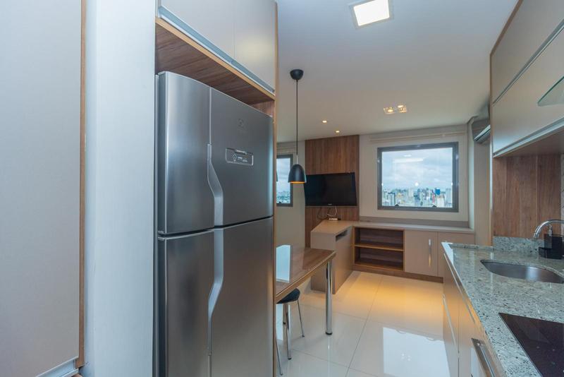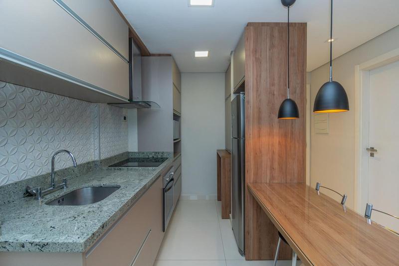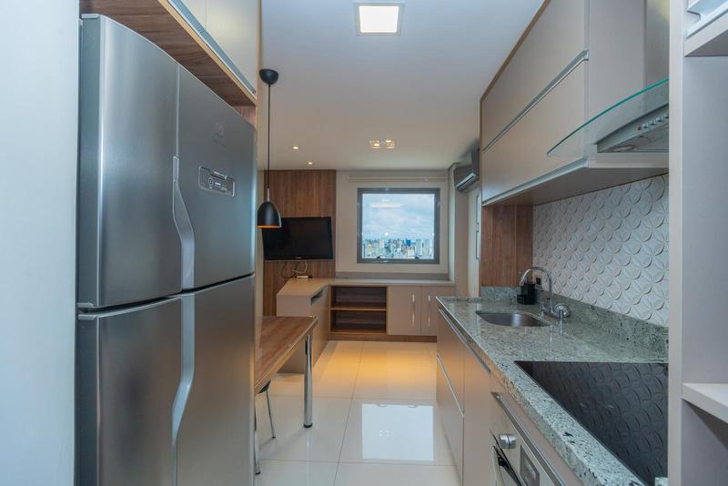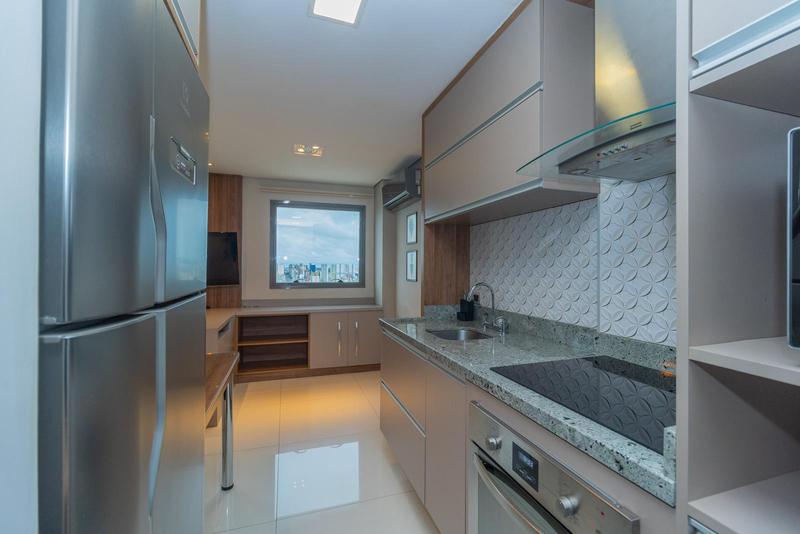 – Cozinha com armários planejados, pia em granito, cook top elétrico, geladeira inox, microondas, coifa e ar condicionado;