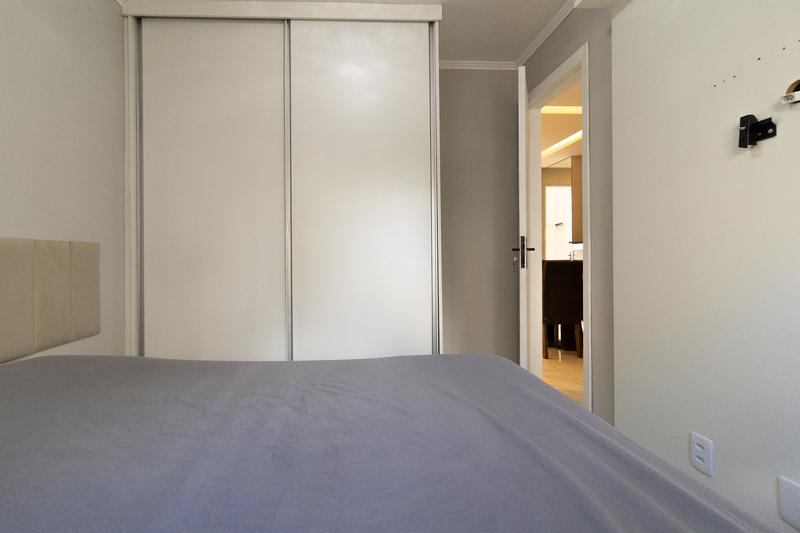 02 Quartos com piso porcelanato e cortina corta-sol embutida, sendo o principal com armário planejado e cabeceira