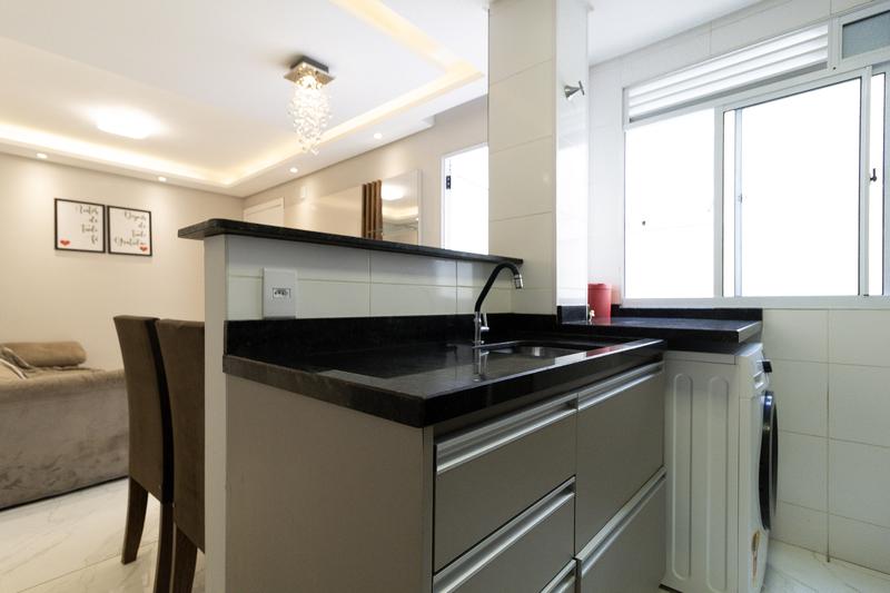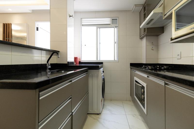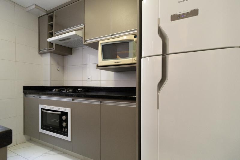 Cozinha estruturada com móveis planejados, tampo em granito, geladeira, micro-ondas, forno e sugar