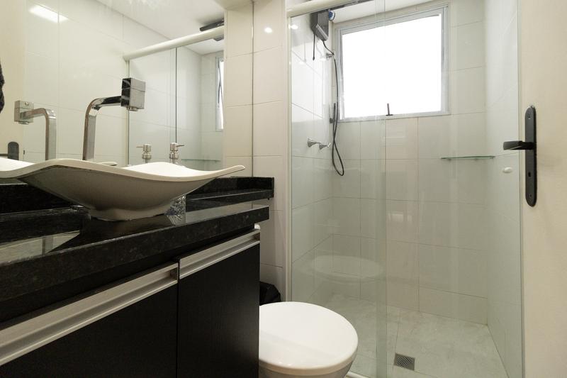 Banheiro social completo apresentando box, chuveiro, balcão com pia e tampo em granito