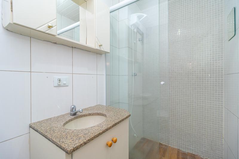 – Banheiro com armário, espelho e box em blindex