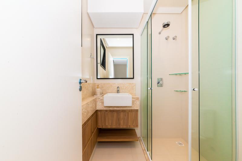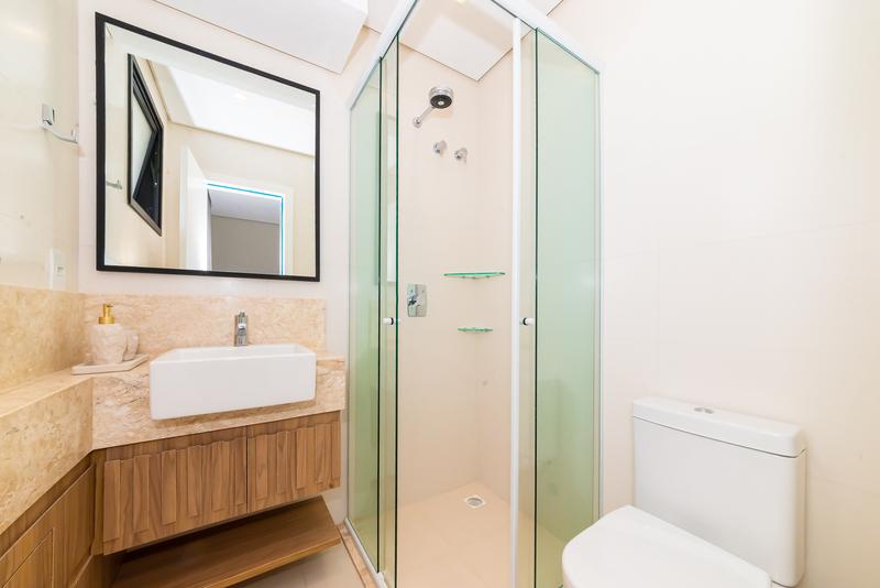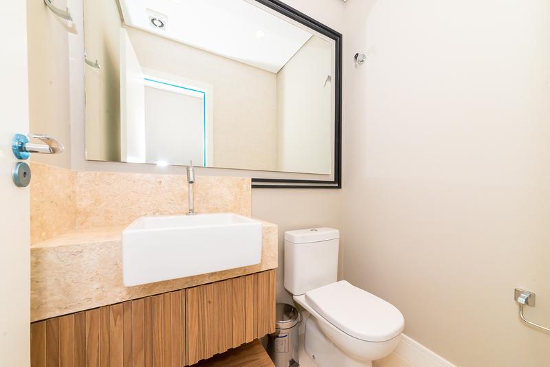 Banheiro social com acabamento moderno e elegante.