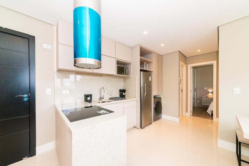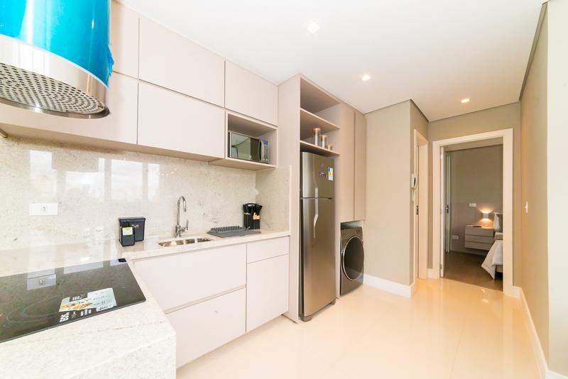 Cozinha completa, equipada com móveis planejados, máquina de lavar louça, fogão elétrico e lava e seca.