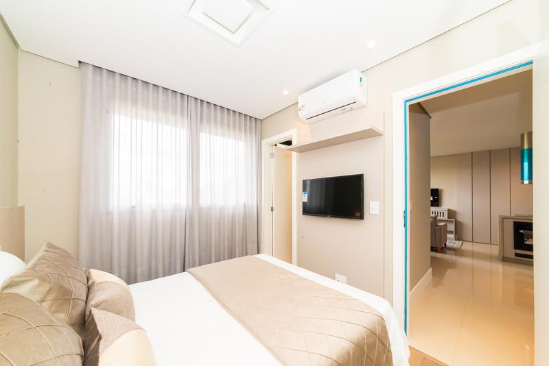 Suíte ampla com cama de casal, closet e ar-condicionado, proporcionando conforto e organização.