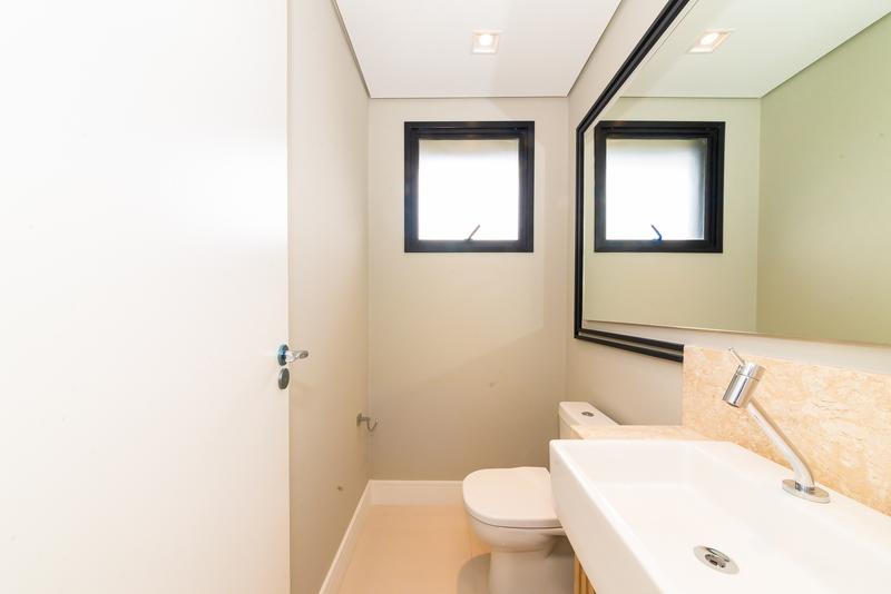 Banheiro social com acabamento moderno e elegante.