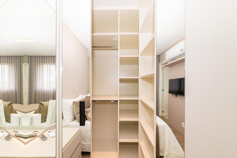 Suíte ampla com cama de casal, closet e ar-condicionado, proporcionando conforto e organização.