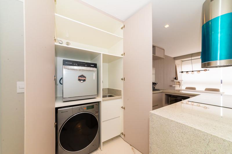 Cozinha completa, equipada com móveis planejados, máquina de lavar louça, fogão elétrico e lava e seca.