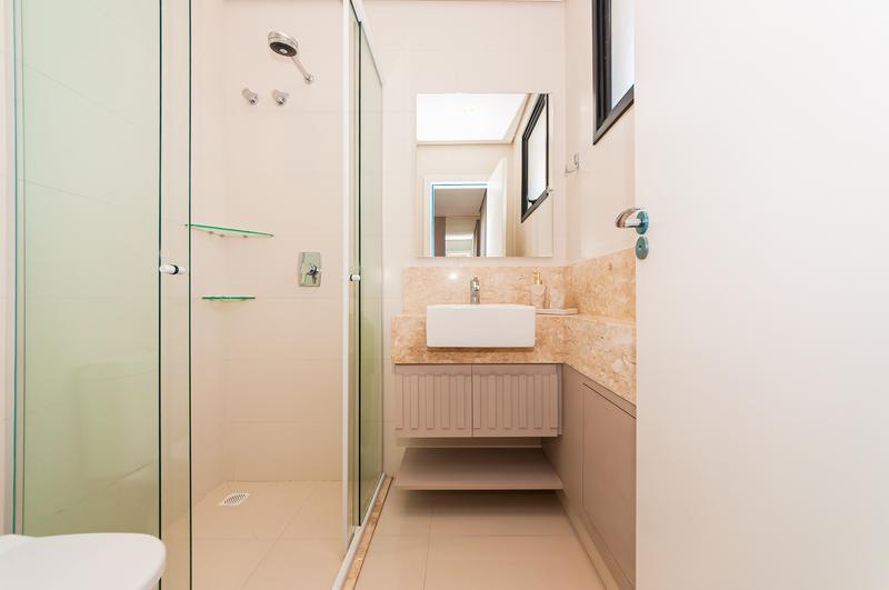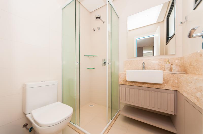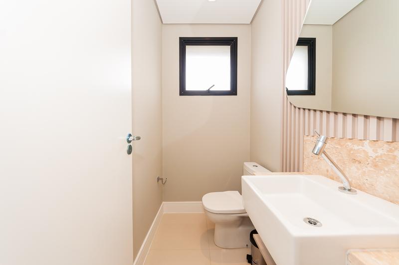 Banheiro social com acabamento moderno e elegante.