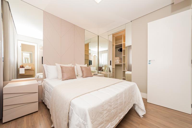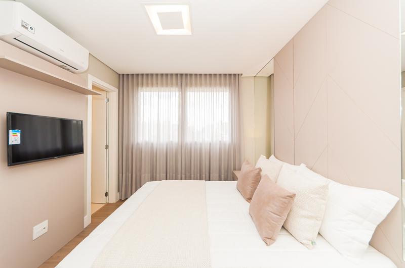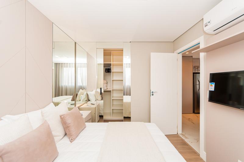 Suíte ampla com cama de casal, closet e ar-condicionado, proporcionando conforto e organização.