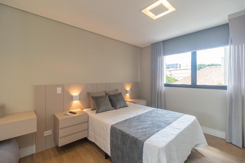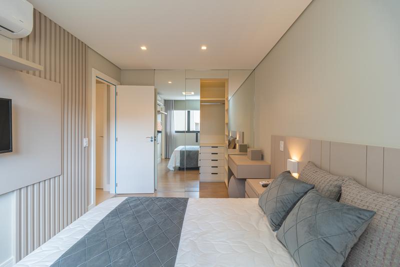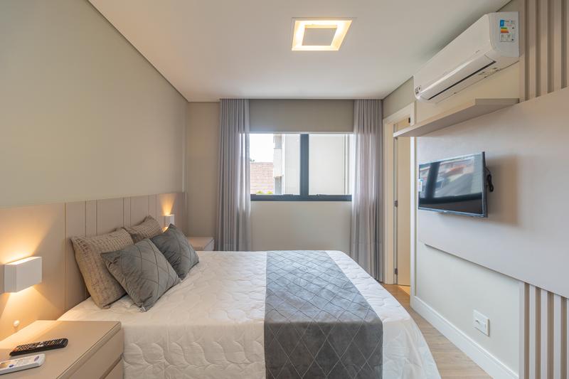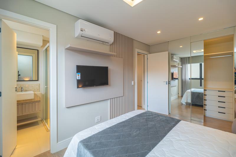– 1 suíte completa, com armário planejado, cama queen, cabeceira, mesas de cabeceira, painel com TV e ar-condicionado;