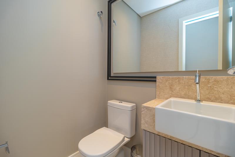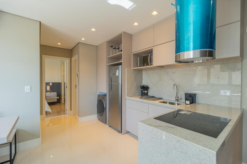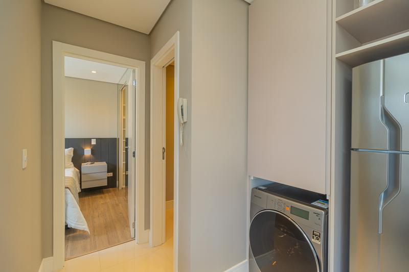 Com ambientes integrados e bem iluminados, o imóvel apresenta cozinha em conceito aberto equipada com armários planejados, cooktop, coifa, forno embutido, micro-ondas e geladeira. A lavanderia é discreta e funcional, contando com máquina lava e seca embutida.