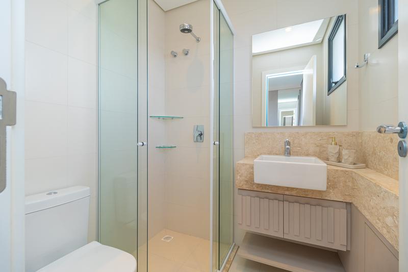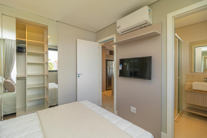 A suíte é confortável e elegante, equipada com armários planejados, cama queen, painel para TV e ar-condicionado. O banheiro conta com armário, espelho e box em blindex.