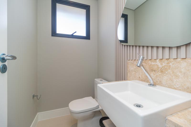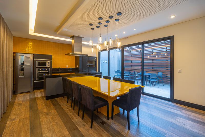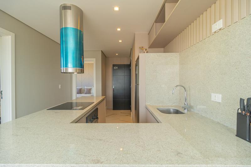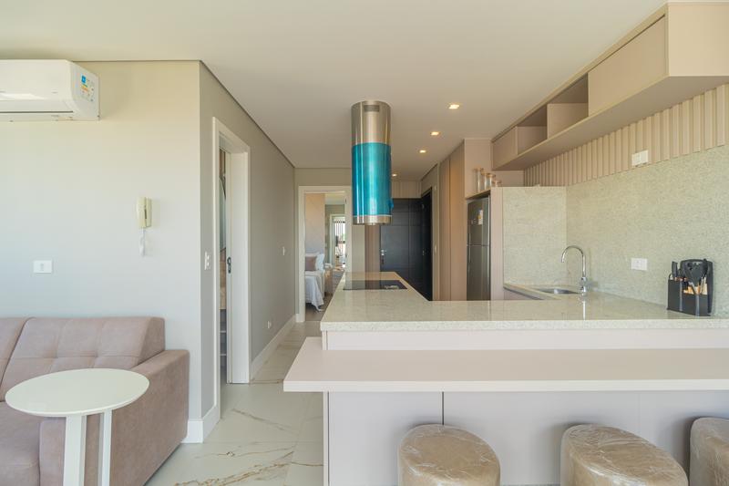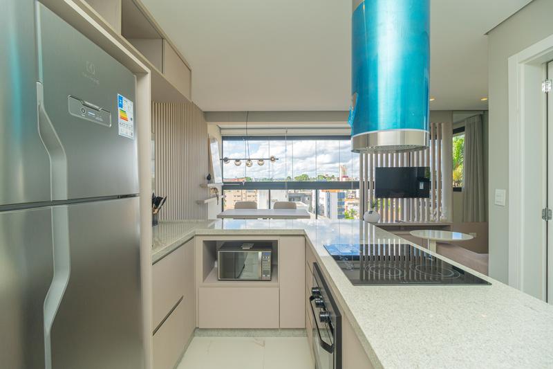 Com planta moderna e funcional, o imóvel conta com cozinha em conceito aberto equipada com armários planejados, cooktop, coifa, forno embutido, micro-ondas e geladeira. A lavanderia é integrada e dispõe de máquina lava e seca.
