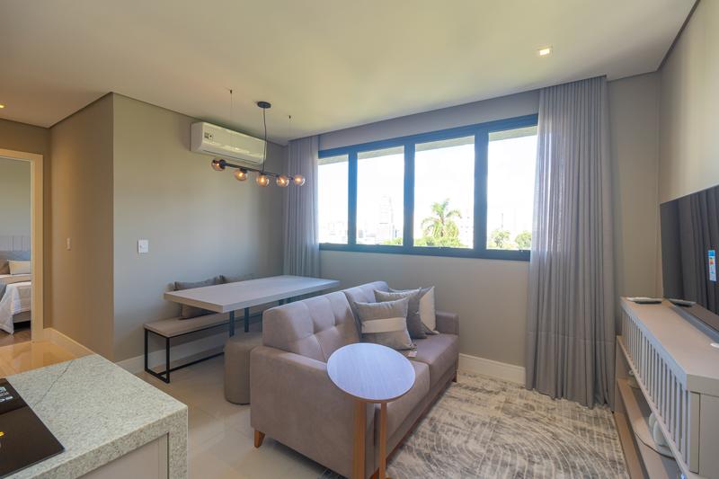 – Sala para dois ambientes, mobiliada com sofá, mesa de jantar, rack para TV, lavabo, bancada para escritório e ou home office, acesso para sacada e ar-condicionado;