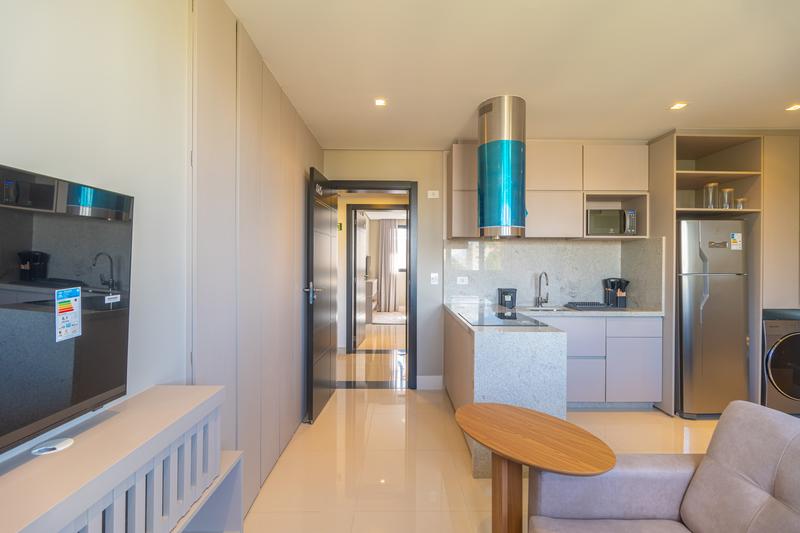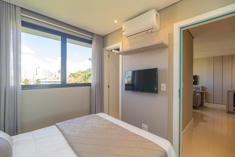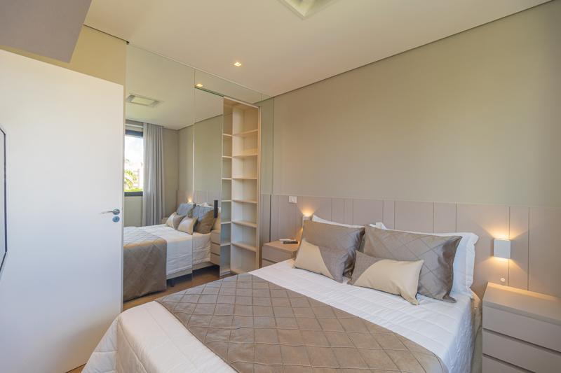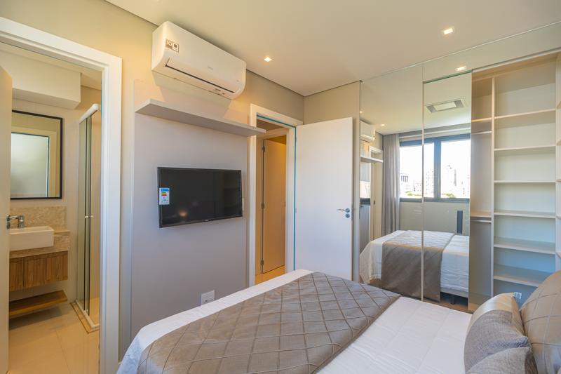 – 1 suíte completa, com armário planejado, cama queen, cabeceira, mesas de cabeceira, painel com TV e ar-condicionado;