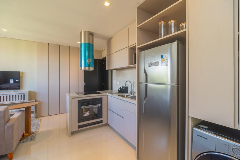 – Cozinha em conceito aberto, com armários planejados, cooktop, coifa, micro-ondas, forno embutido e geladeira;