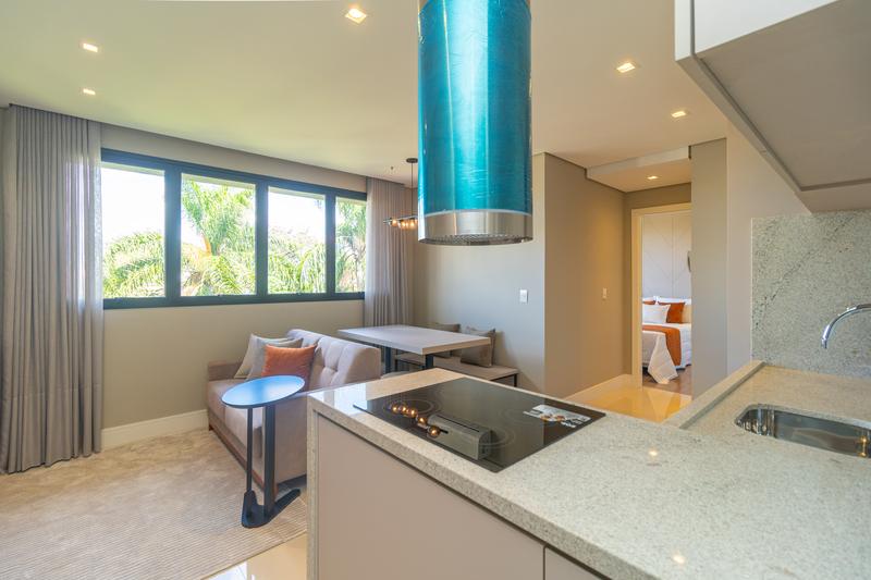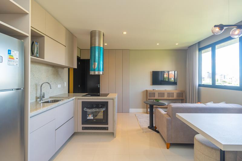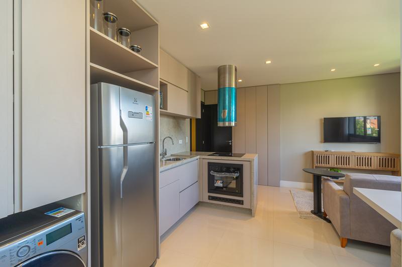 Com planta moderna e bem distribuída, o imóvel conta com cozinha em conceito aberto, equipada com armários planejados, cooktop, coifa, forno embutido, micro-ondas e geladeira. A lavanderia é integrada e dispõe de máquina lava e seca, garantindo praticidade no dia a dia.