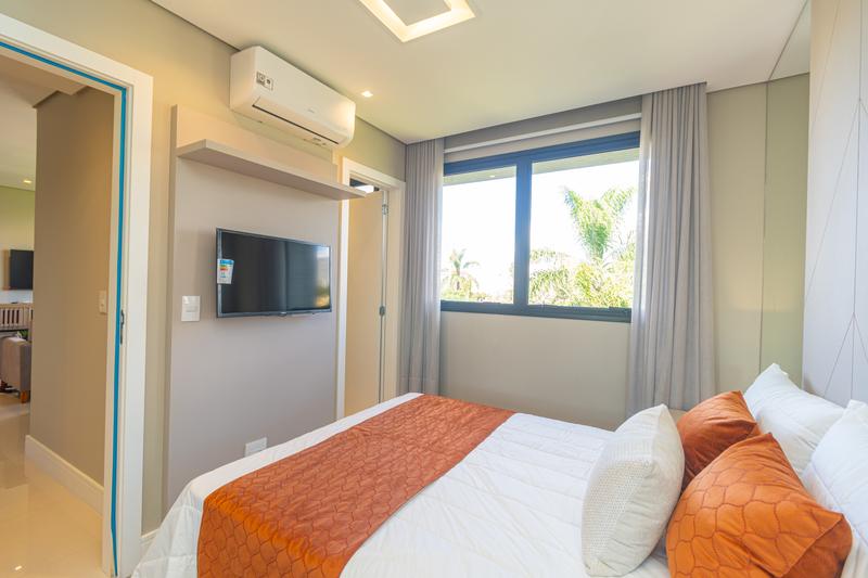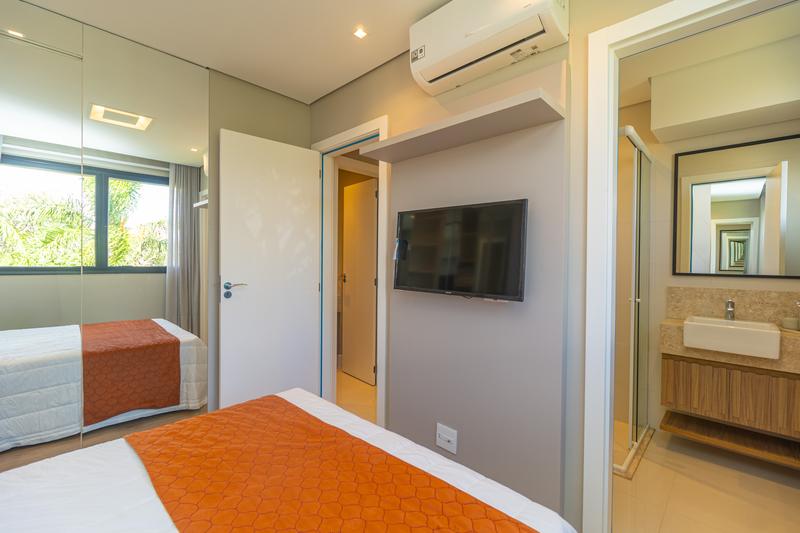 A suíte é confortável e bem planejada, equipada com armários, cama queen, painel para TV e ar-condicionado. O banheiro possui armário, espelho e box em blindex.