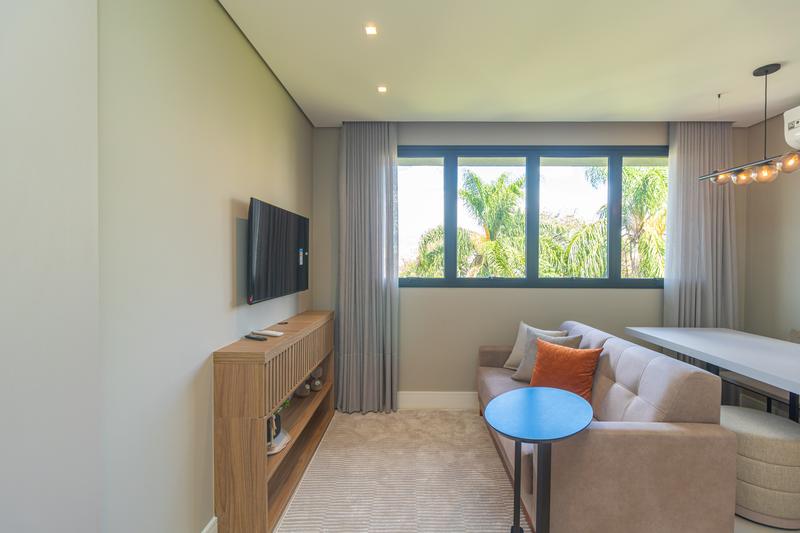 A área social integra sala de estar e jantar, totalmente mobiliadas, com ar-condicionado, lavabo e bancada para home office. A ampla janela proporciona excelente iluminação natural e agradável vista, tornando o ambiente ainda mais aconchegante.