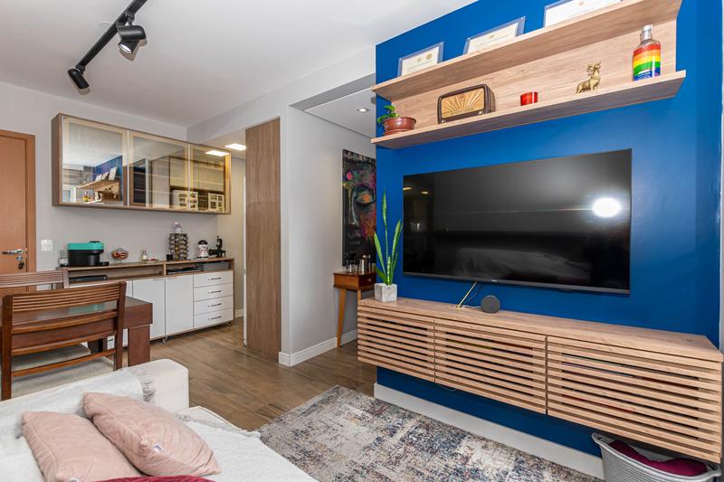 Sala: Sofá retrátil de 2 lugares, feito sob medida para otimizar o espaço.