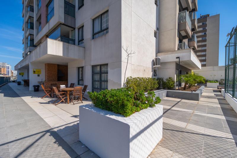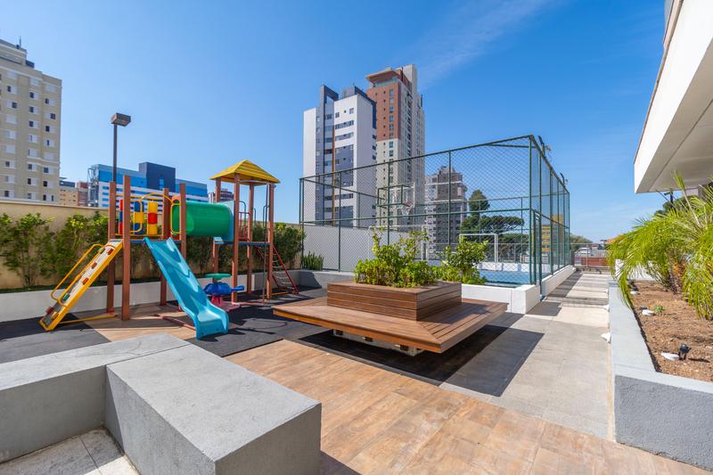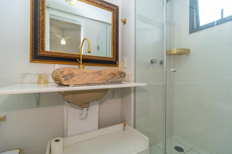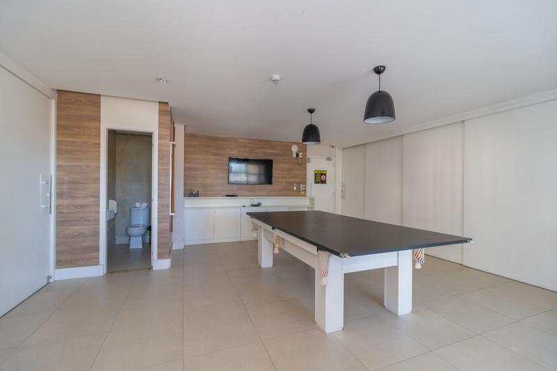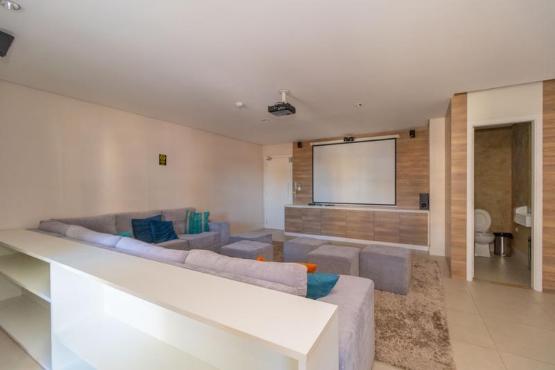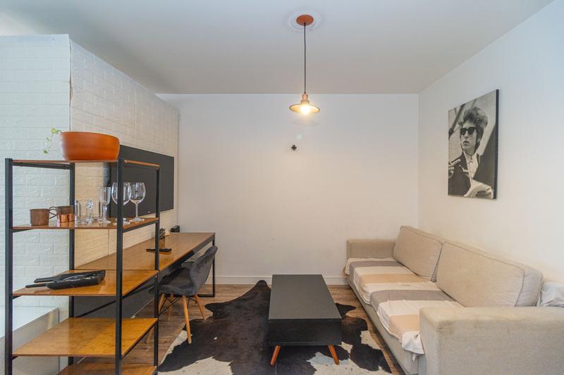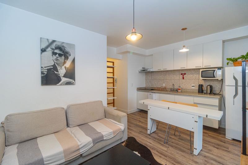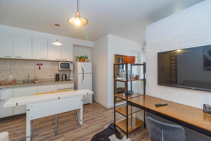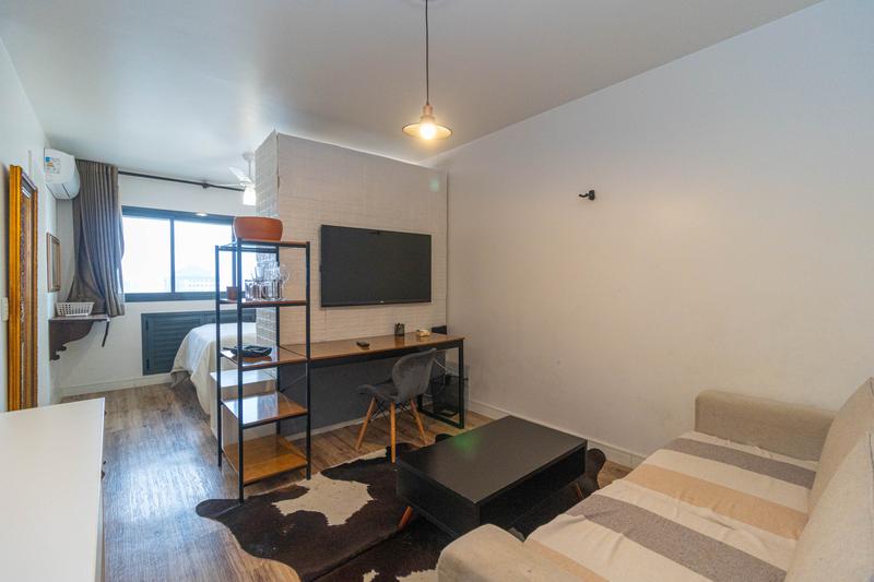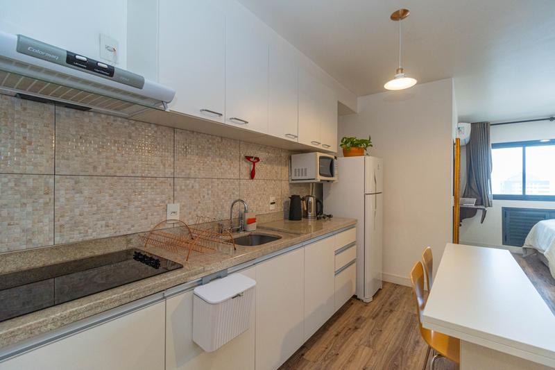 – Em um ambiente todo integrado, o studio dispões de um espaço para sala com sofá retrátil, mesa para estudos e ou home office, uma TV, e uma mesa,