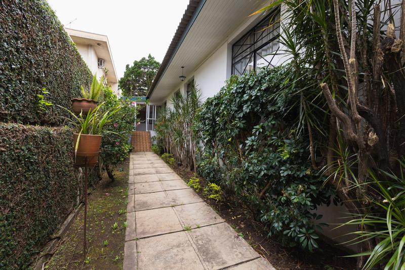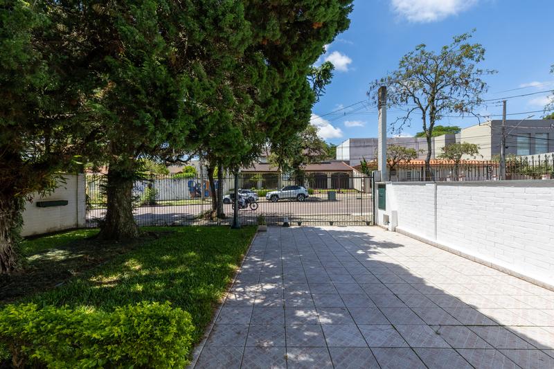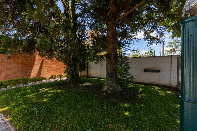 Jardim com gramado e árvores, trazendo um ambiente agradável e proporcionando uma boa apresentação externa.