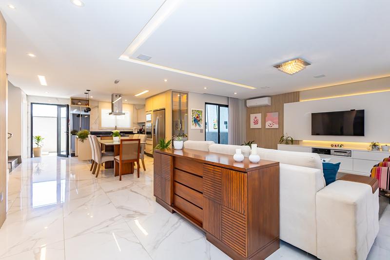 Toda a casa possui teto rebaixado em gesso e iluminação embutida.