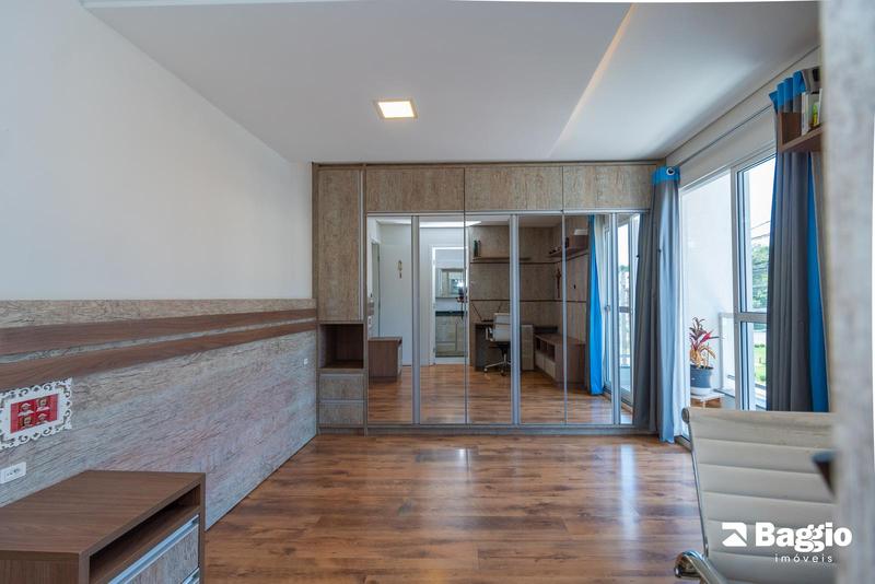 Suíte master com armários planejados, cabeceira, mesinhas laterais, bancada para estudos/home office e sacada privativa.