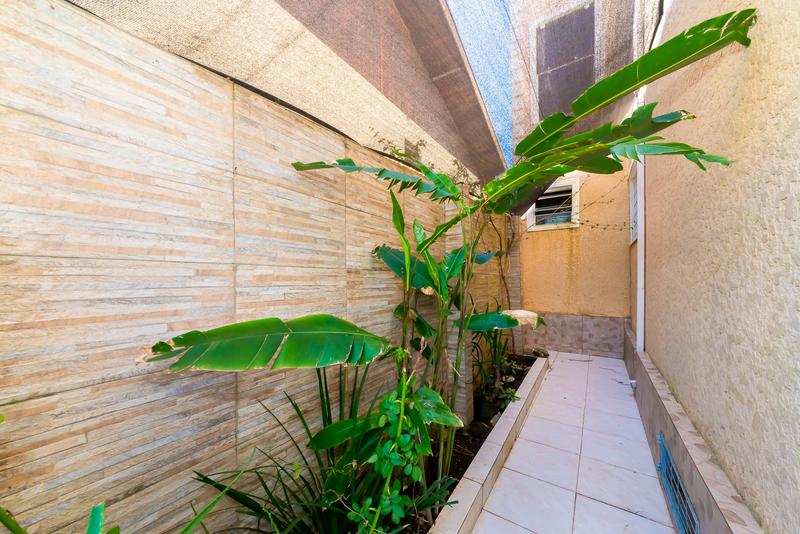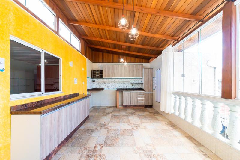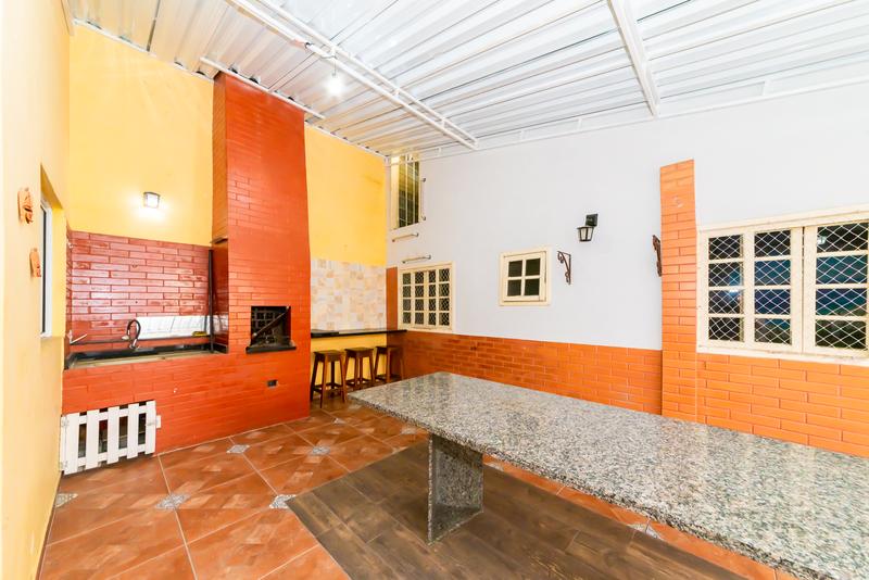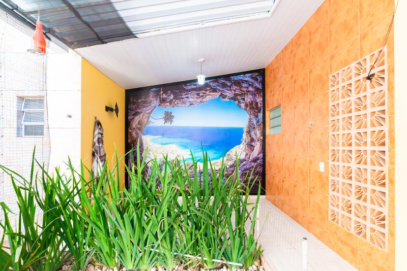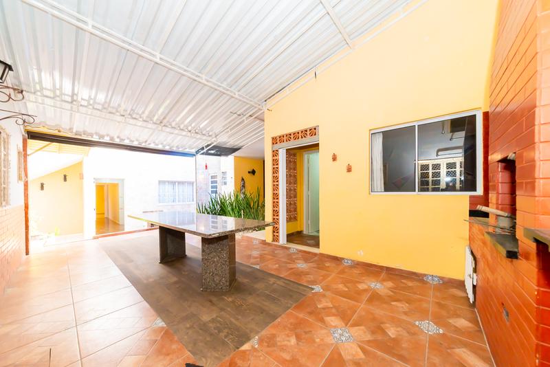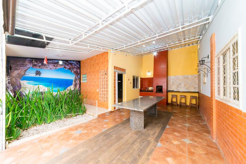 Nos fundos, a área externa convida ao convívio: espaço gourmet com churrasqueira, mesa para grandes encontros e ambiente aconchegante para redes ou descanso.