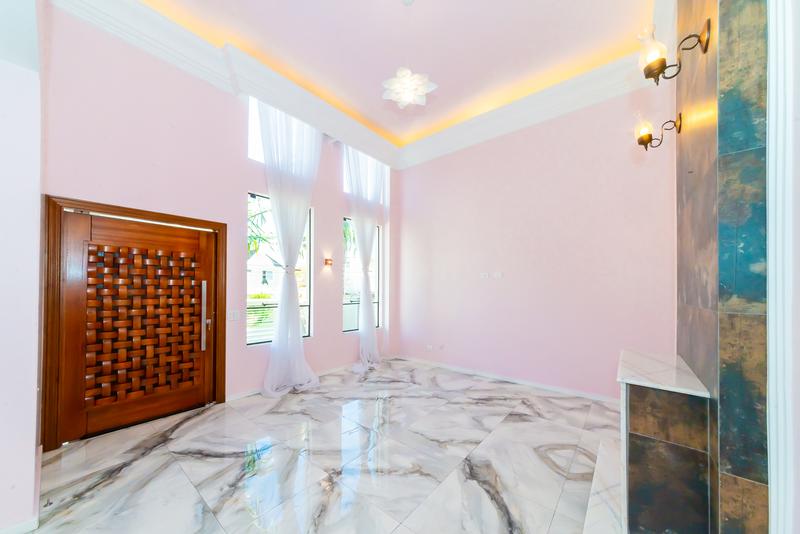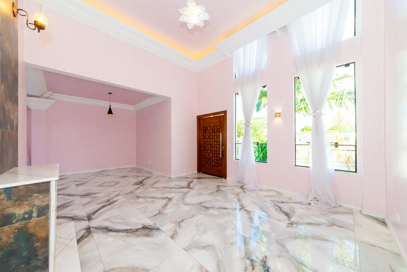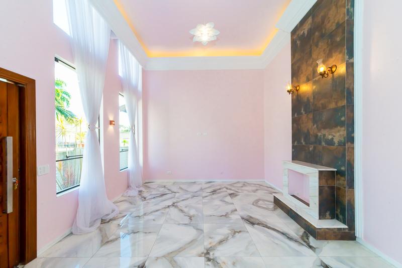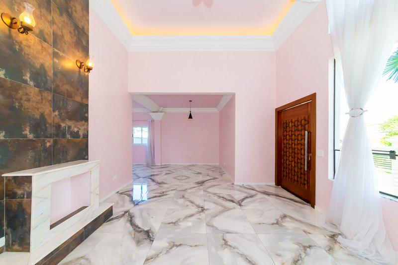 Logo na entrada, a casa já impressiona com um ambiente social integrado, pé-direito alto e grandes janelas que garantem luminosidade natural e ventilação constante.