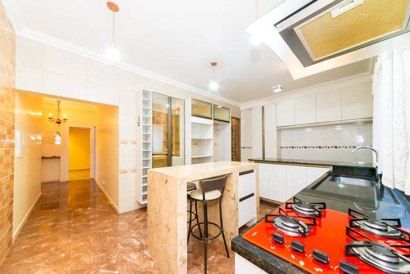 A cozinha planejada é funcional e moderna, equipada com armários, cooktop, coifa e bancada central, ideal para o dia a dia.