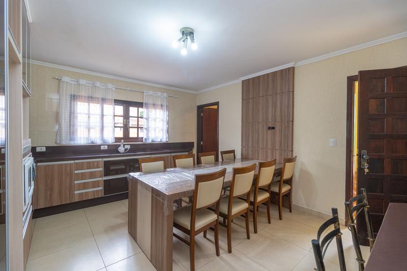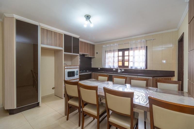 – Cozinha com armários, cooktop e forno, em anexo uma copa com mesa de 8 lugares e um painel para TV,