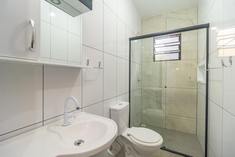 – Banheiro social com armário, espelho e box em blindex,