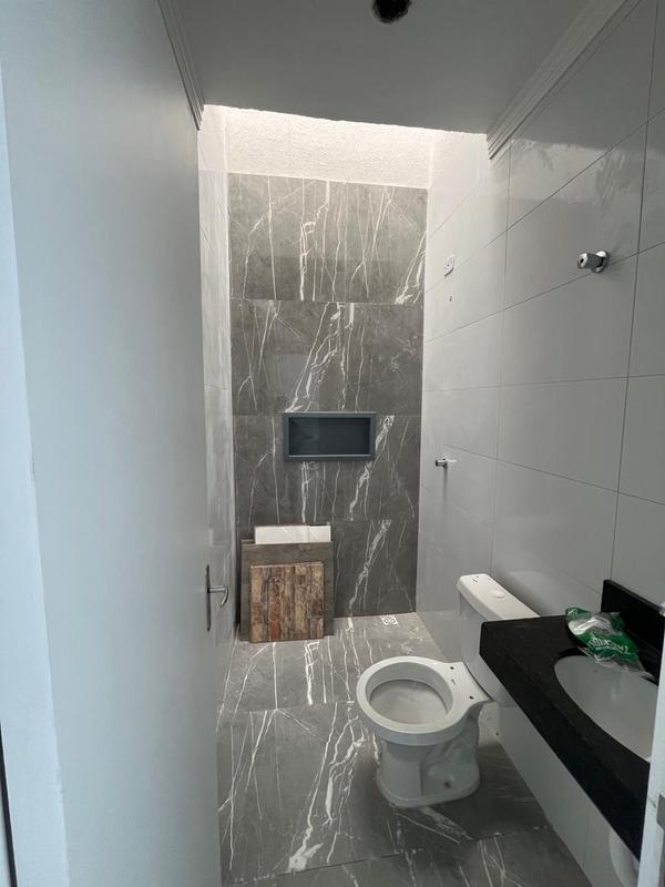 Banheiro social com vaso e pia, oferecendo praticidade e fácil manutenção.