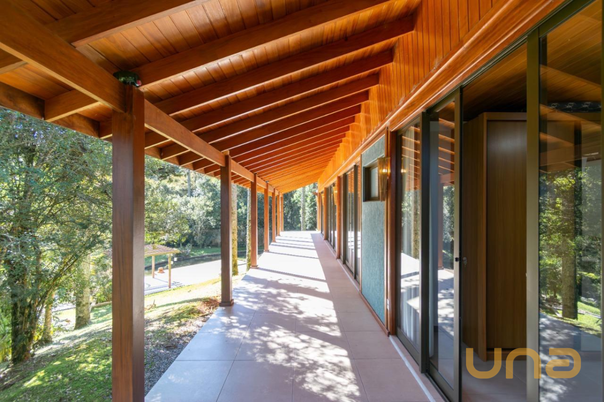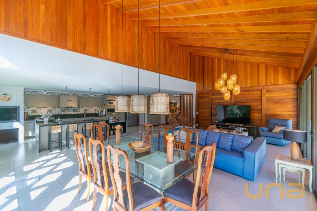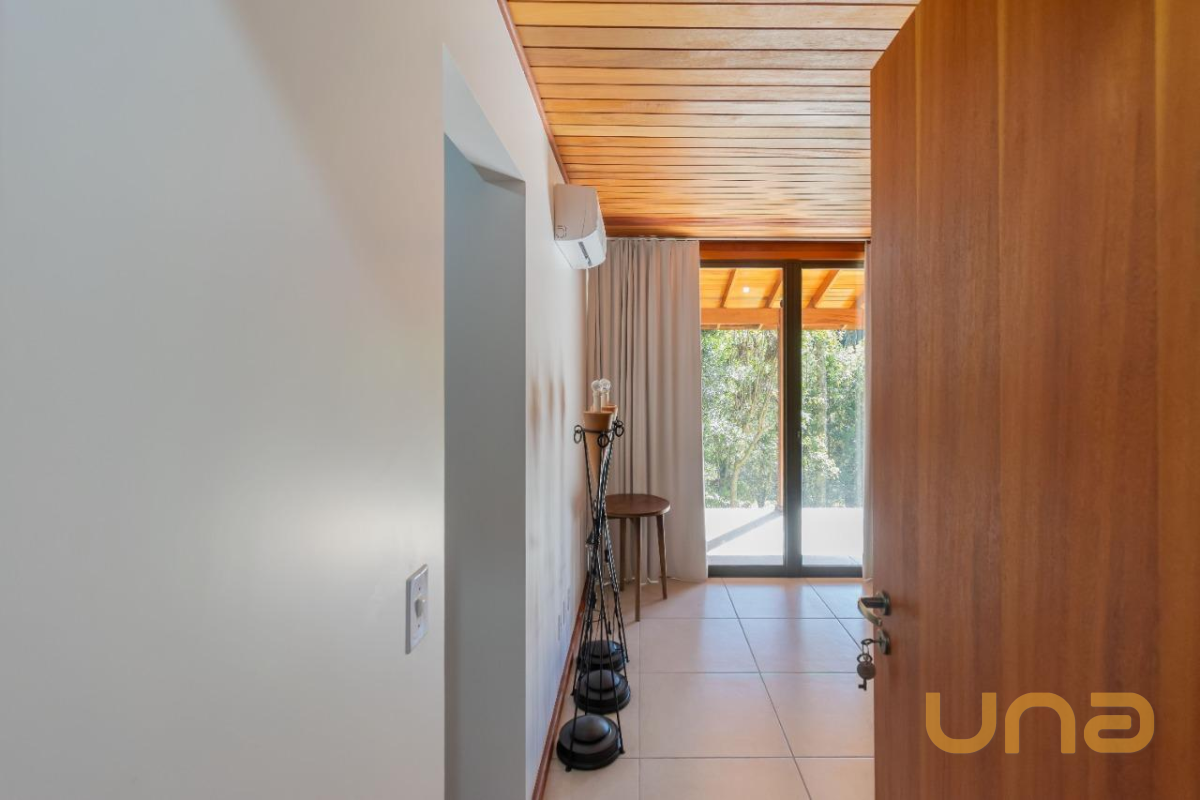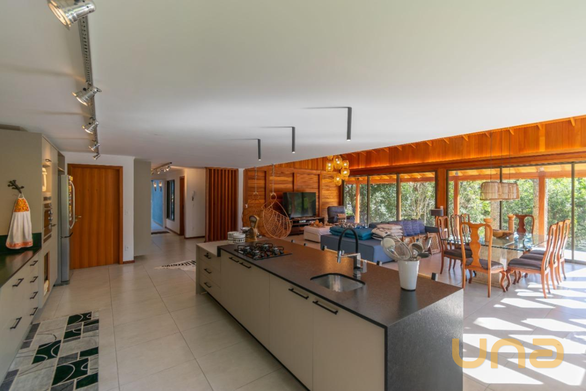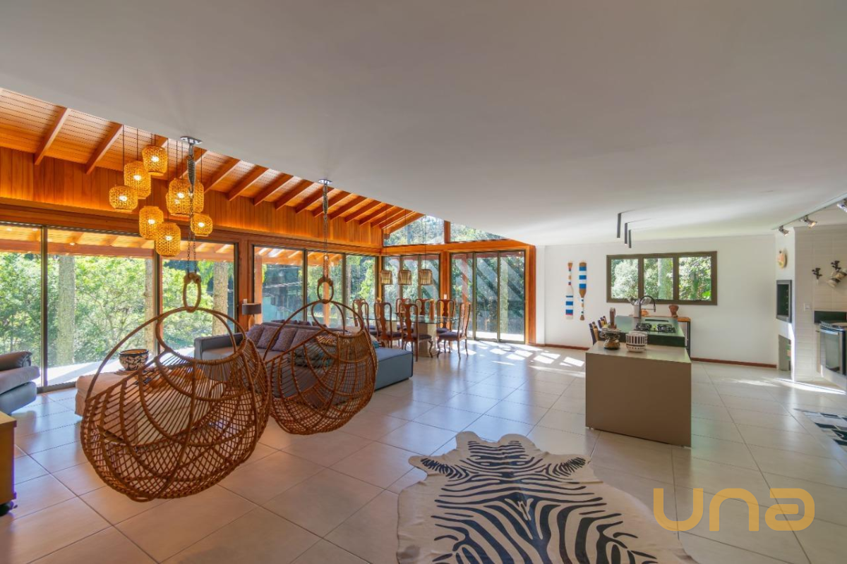 Logo ao entrar, você é recebido por um elegante hall de entrada que se abre para uma sala de estar integrada à sala de jantar e à cozinha americana planejada, com churrasqueira. Todo o ambiente é rodeado por amplas janelas de vidro, que trazem ótima iluminação natural e uma vista deslumbrante para o bosque com um lago privativo e deck.
