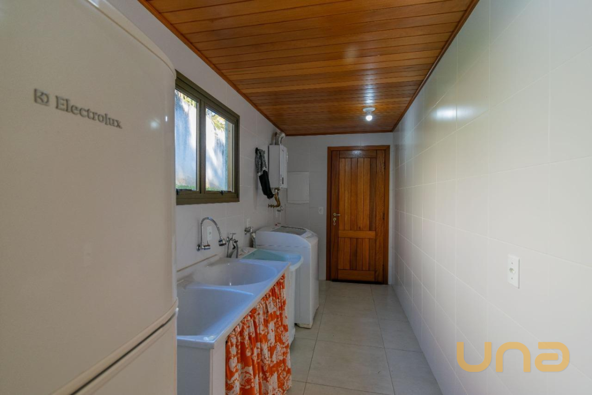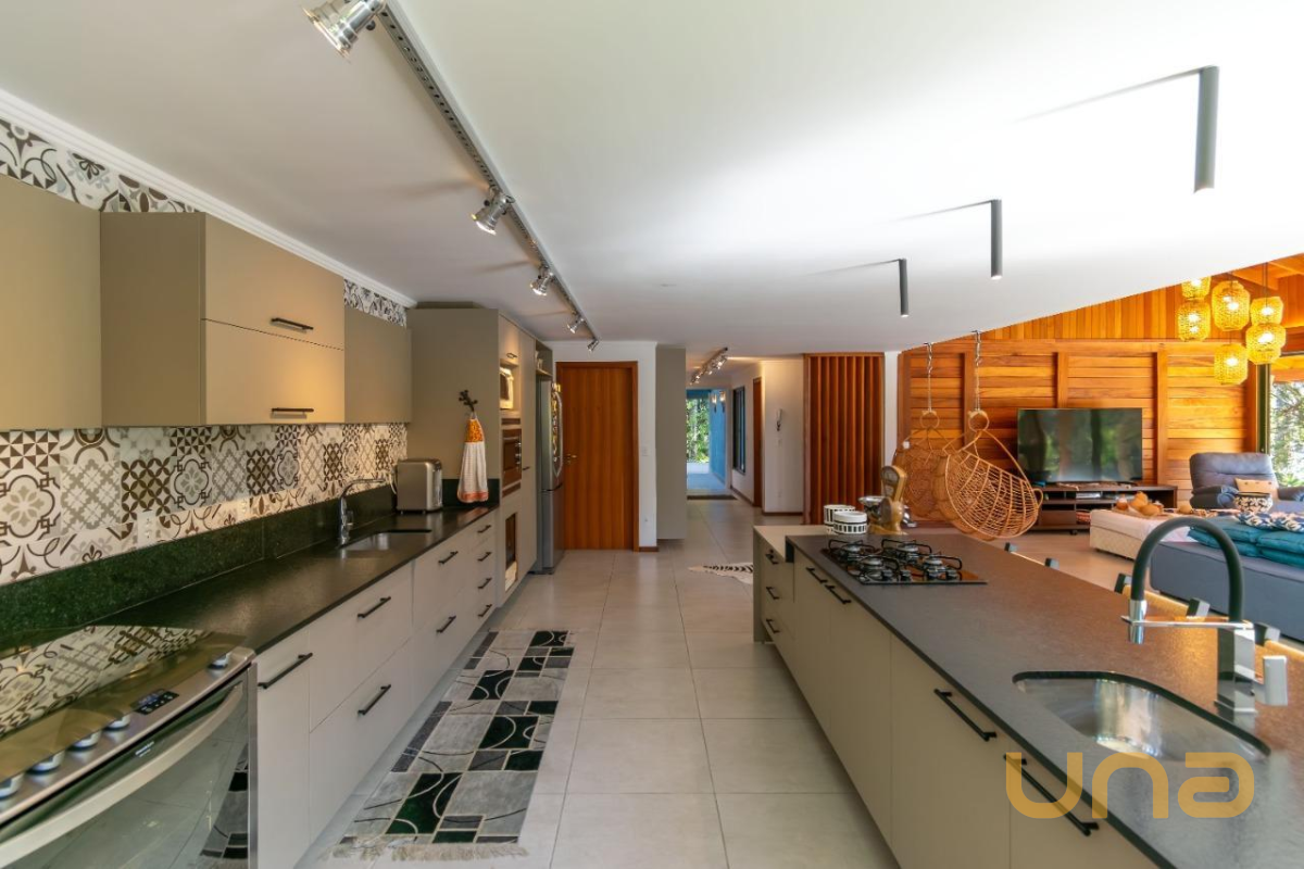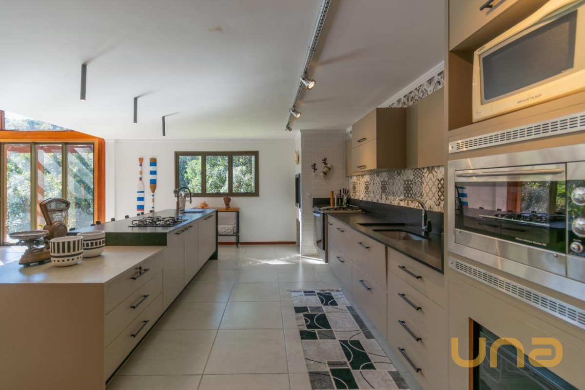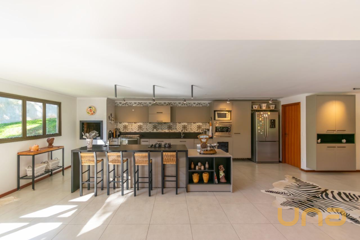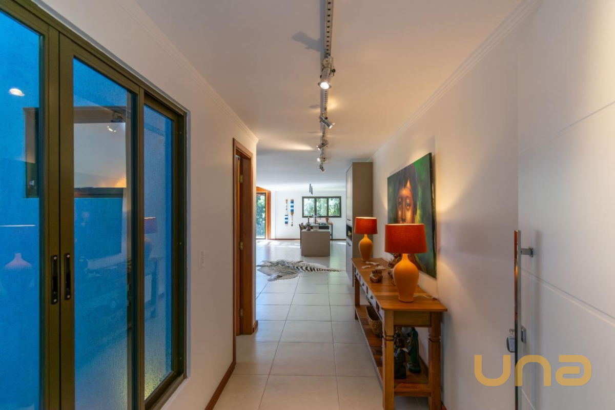 Logo ao entrar, você é recebido por um elegante hall de entrada que se abre para uma sala de estar integrada à sala de jantar e à cozinha americana planejada, com churrasqueira. Todo o ambiente é rodeado por amplas janelas de vidro, que trazem ótima iluminação natural e uma vista deslumbrante para o bosque com um lago privativo e deck.