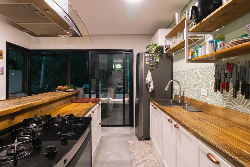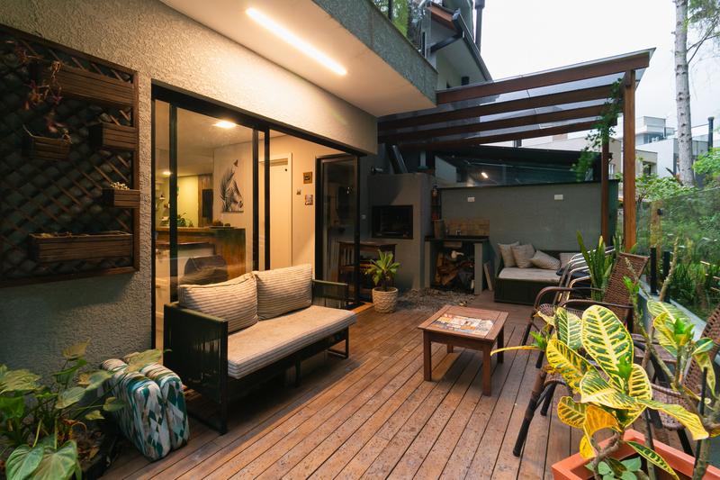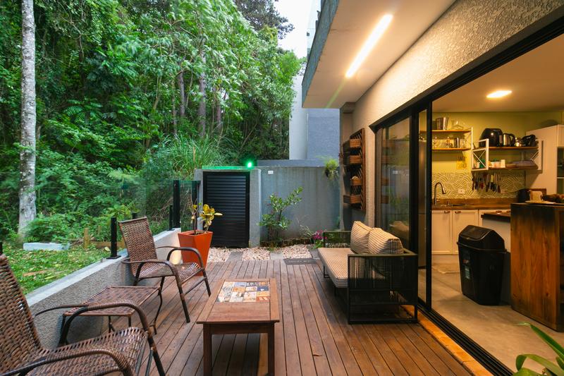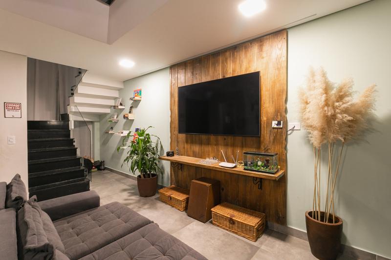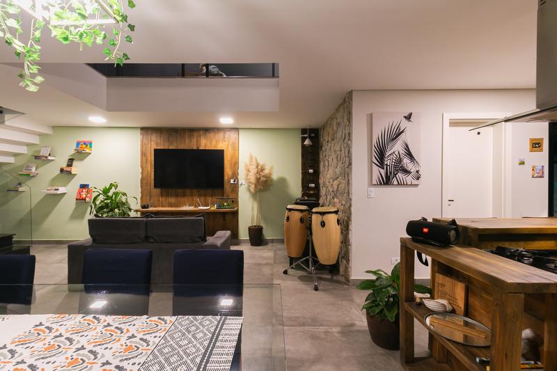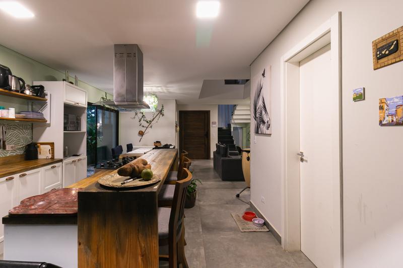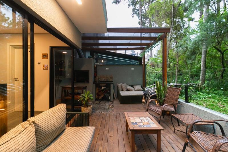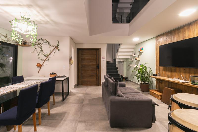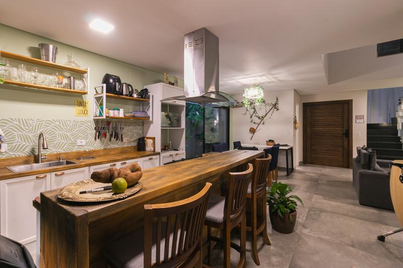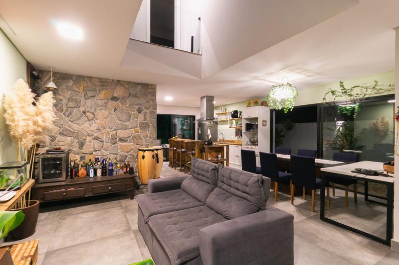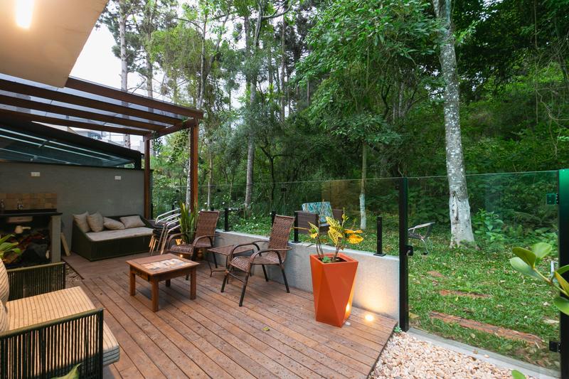 Térreo: Sala ampla para 2 ambientes e integrada com a cozinha, lavabo, despensa, fundos com deck, pergolado, churrasqueira e pia de apoio, central de gás individual. 2 vagas.