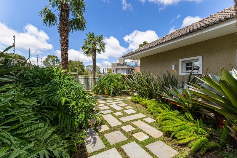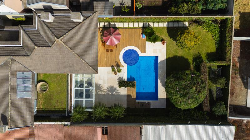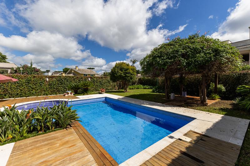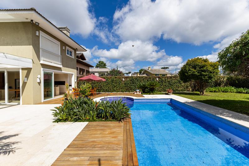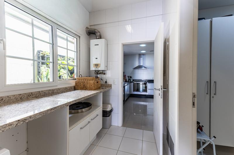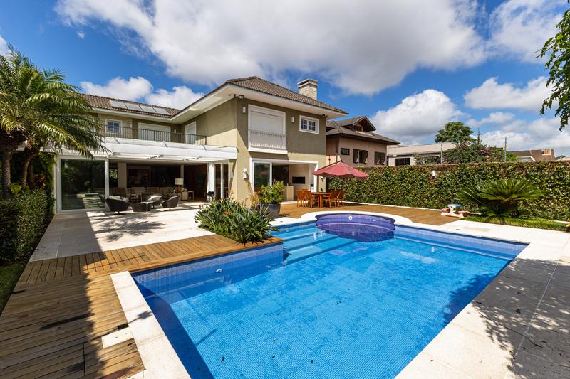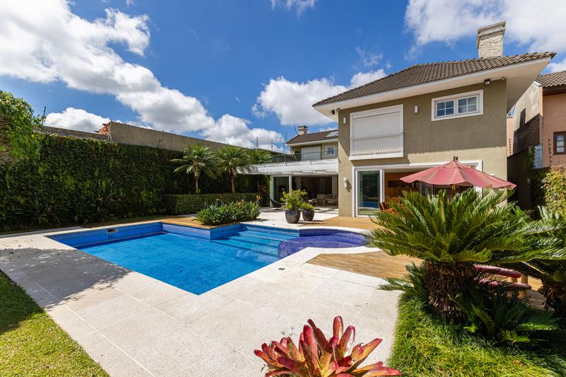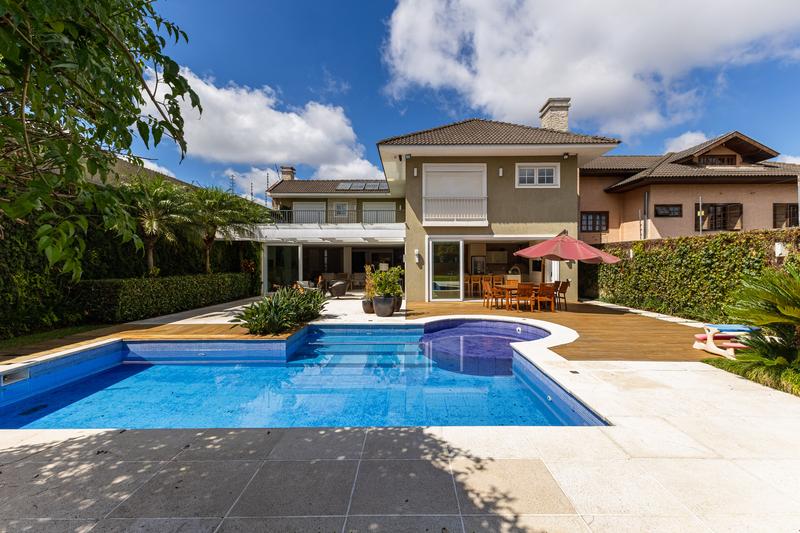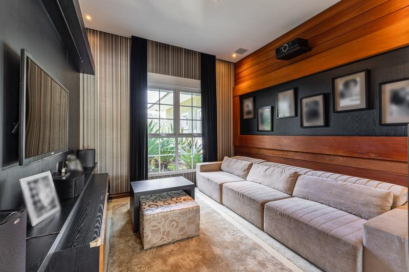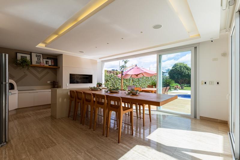 O imóvel conta com um amplo jardim e piscina infantil e adulto. São 5 salas integradas, incluindo 1 sala de estar, 1 sala de jantar, 1 sala de home theater individualizada e uma área gourmet com churrasqueira, forno de pizza, forno de indução e fogão a lenha. Ainda no pavimento térreo há 1 ampla suíte, 2 lavabos (um para visitantes e outro para a área da piscina e gourmet), e uma cozinha espaçosa com despensa. A área de serviço e dependência completa de empregada possuem entrada independente junto à garagem.