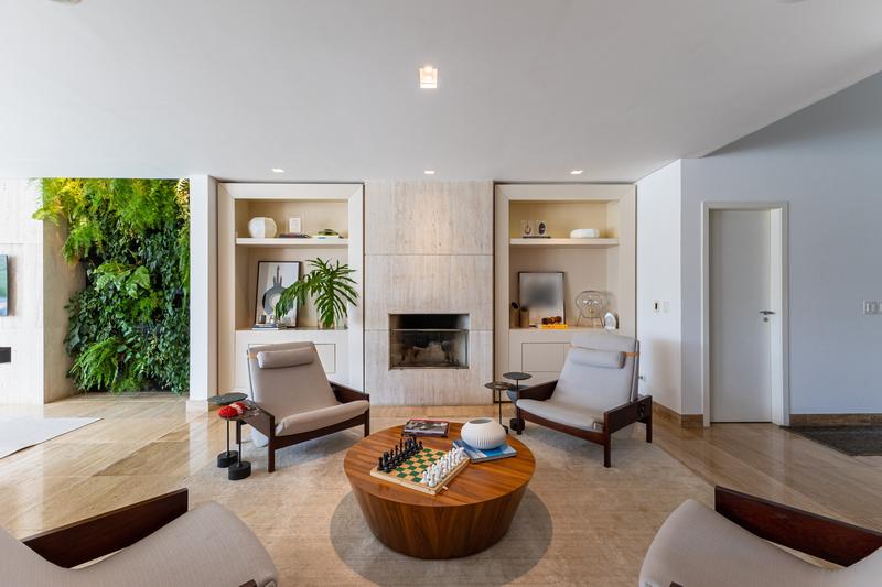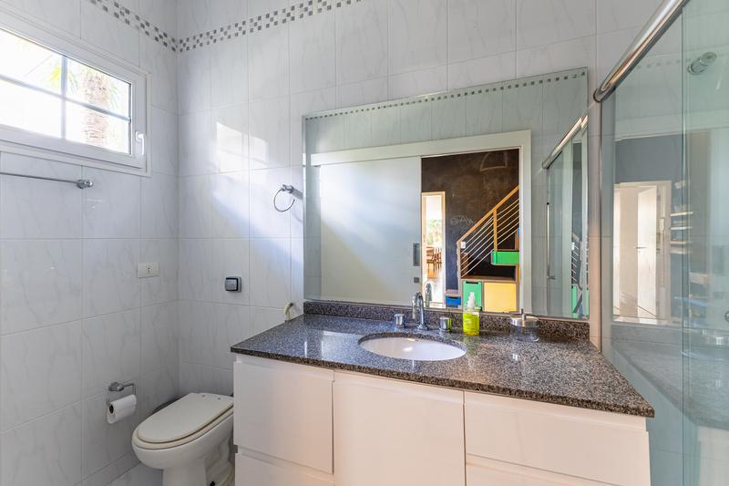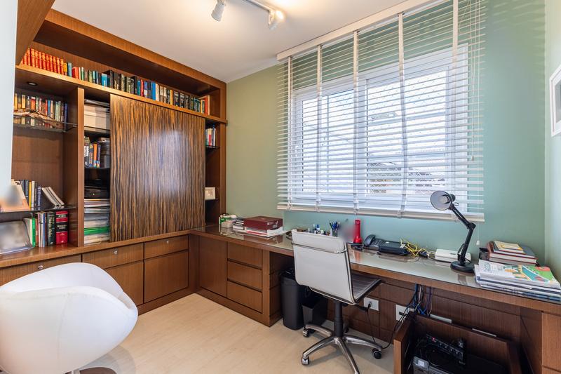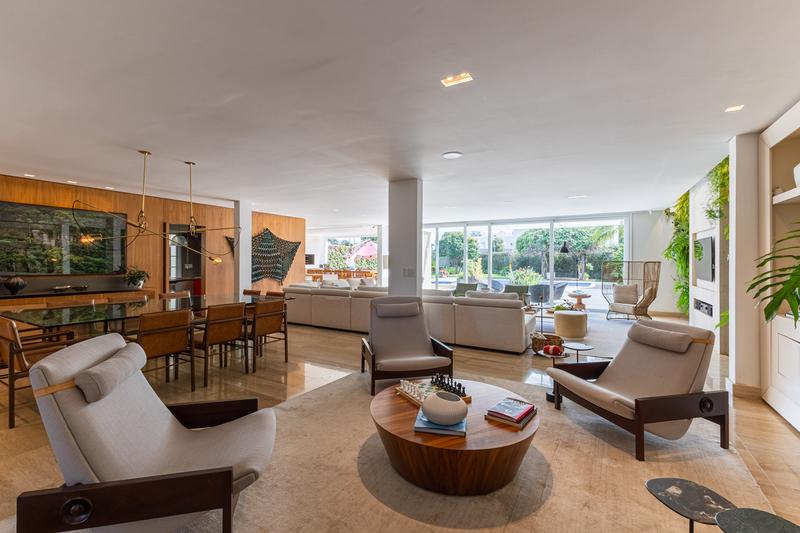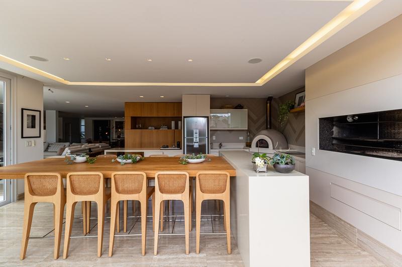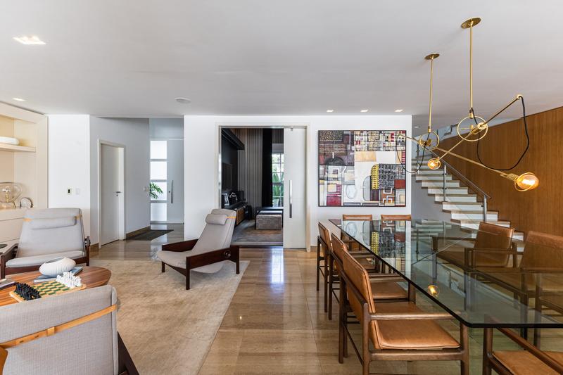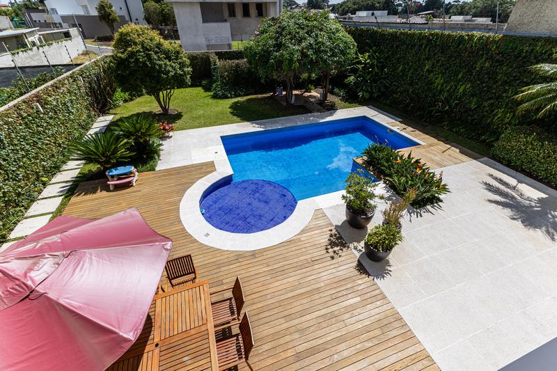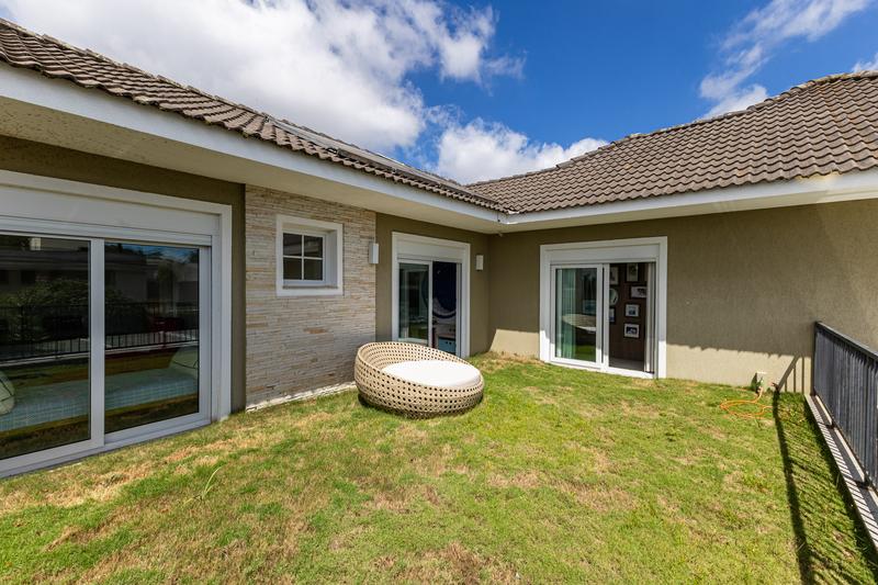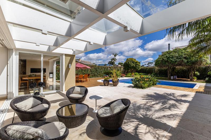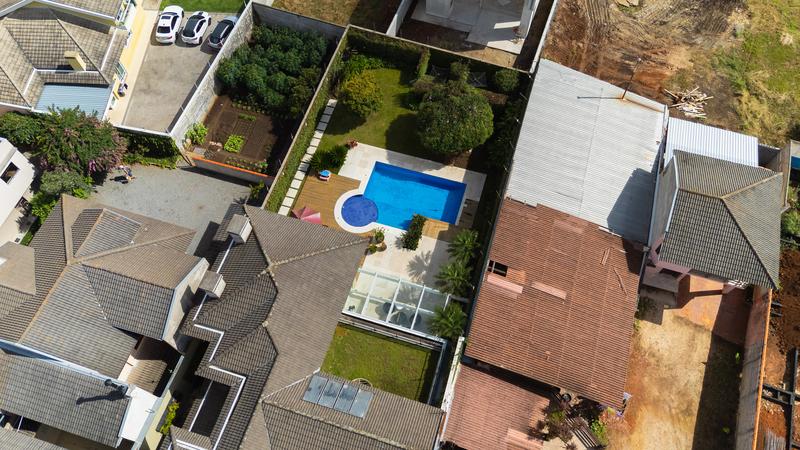 O imóvel conta com um amplo jardim e piscina infantil e adulto. São 5 salas integradas, incluindo 1 sala de estar, 1 sala de jantar, 1 sala de home theater individualizada e uma área gourmet com churrasqueira, forno de pizza, forno de indução e fogão a lenha. Ainda no pavimento térreo há 1 ampla suíte, 2 lavabos (um para visitantes e outro para a área da piscina e gourmet), e uma cozinha espaçosa com despensa. A área de serviço e dependência completa de empregada possuem entrada independente junto à garagem.