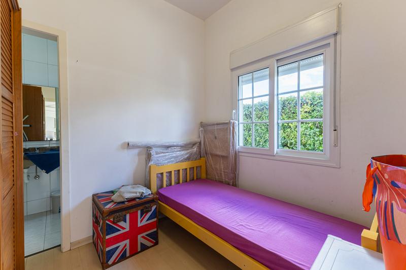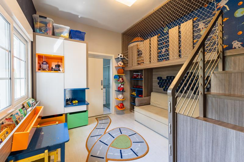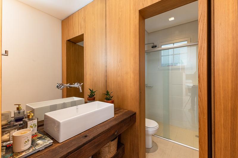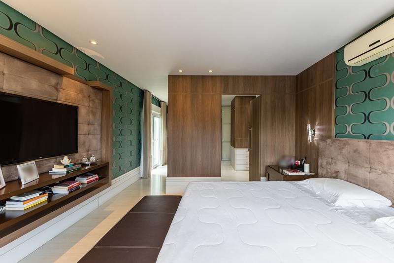 No pavimento superior, a casa dispõe de 3 quartos, sendo 1 suíte master com closet, banheiro individualizado com espaço para maquiagem e banheira, além de sacada. Há também 2 demi-suítes com banheiro de uso comum e um dos quartos com sacada. A circulação conta com um amplo roupeiro.