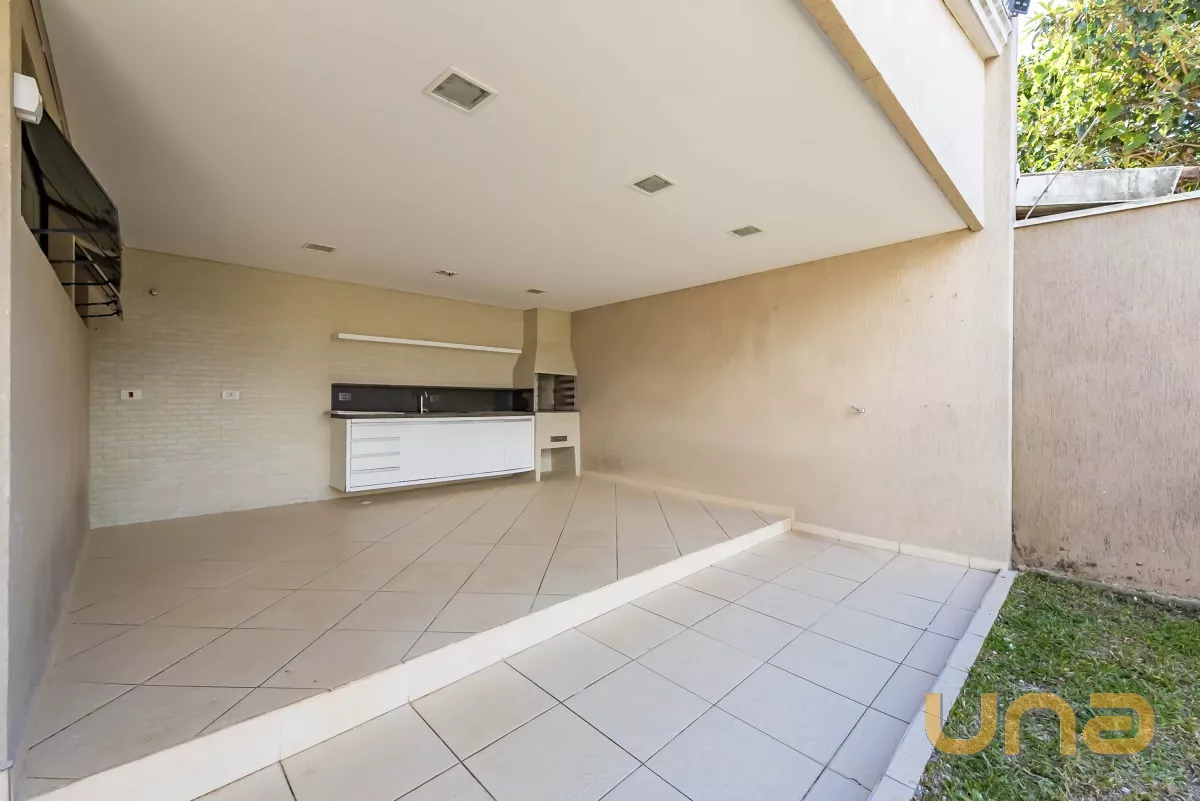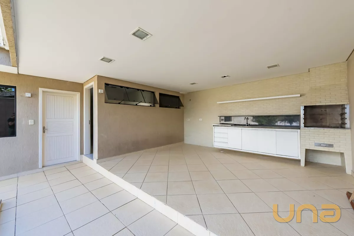 Espaço gourmet coberto com churrasqueira, de frente para um amplo terreno gramado