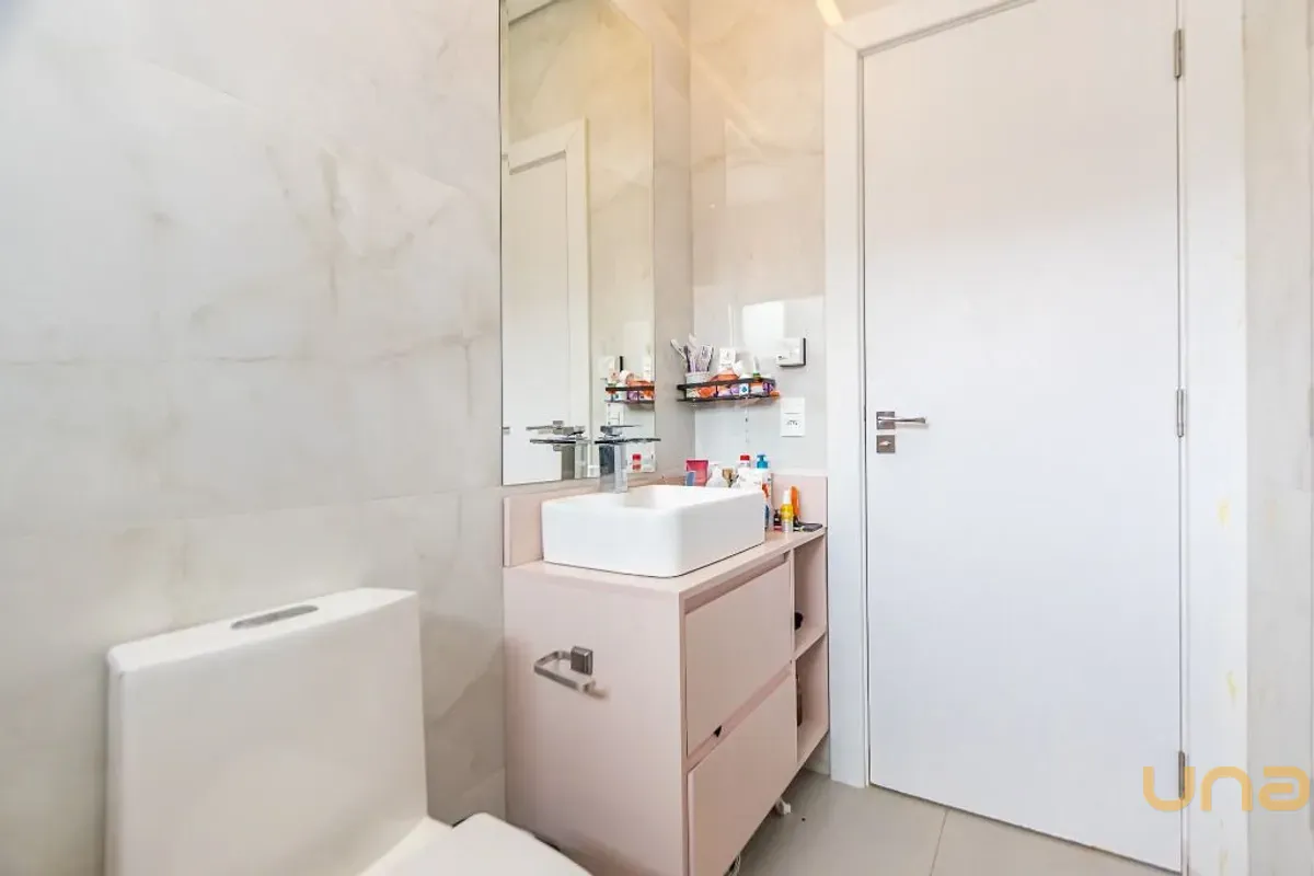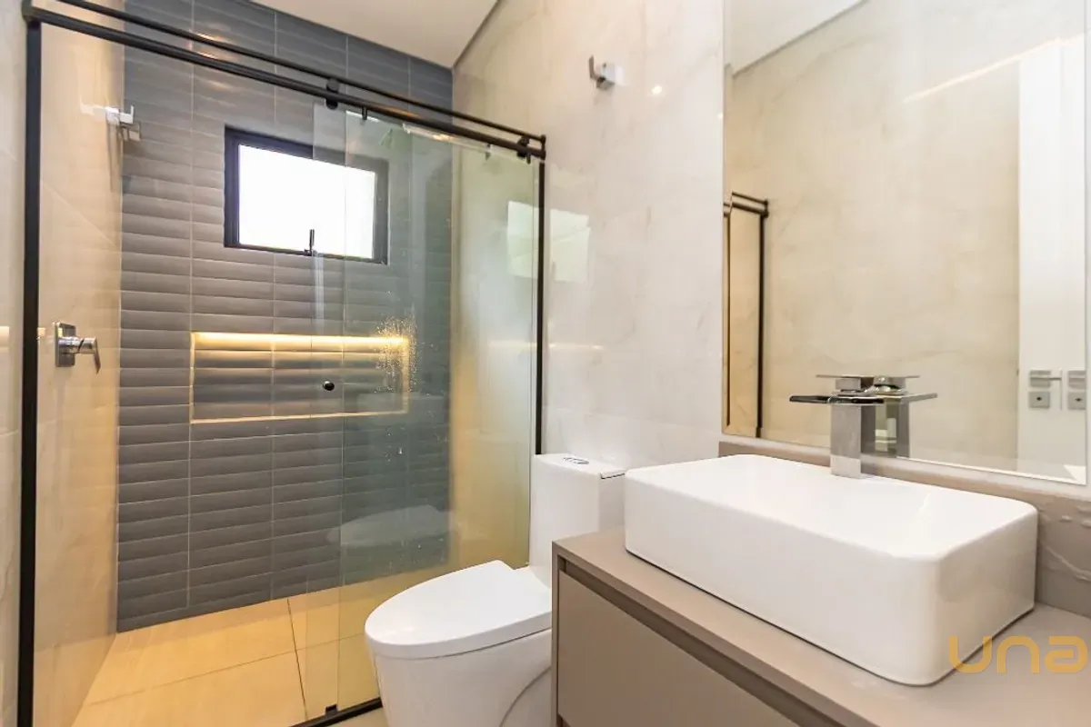 ** Toda a casa com piso em porcelanato no mesmo padrão, dando uniformidade e aquecido nas áreas privativas.