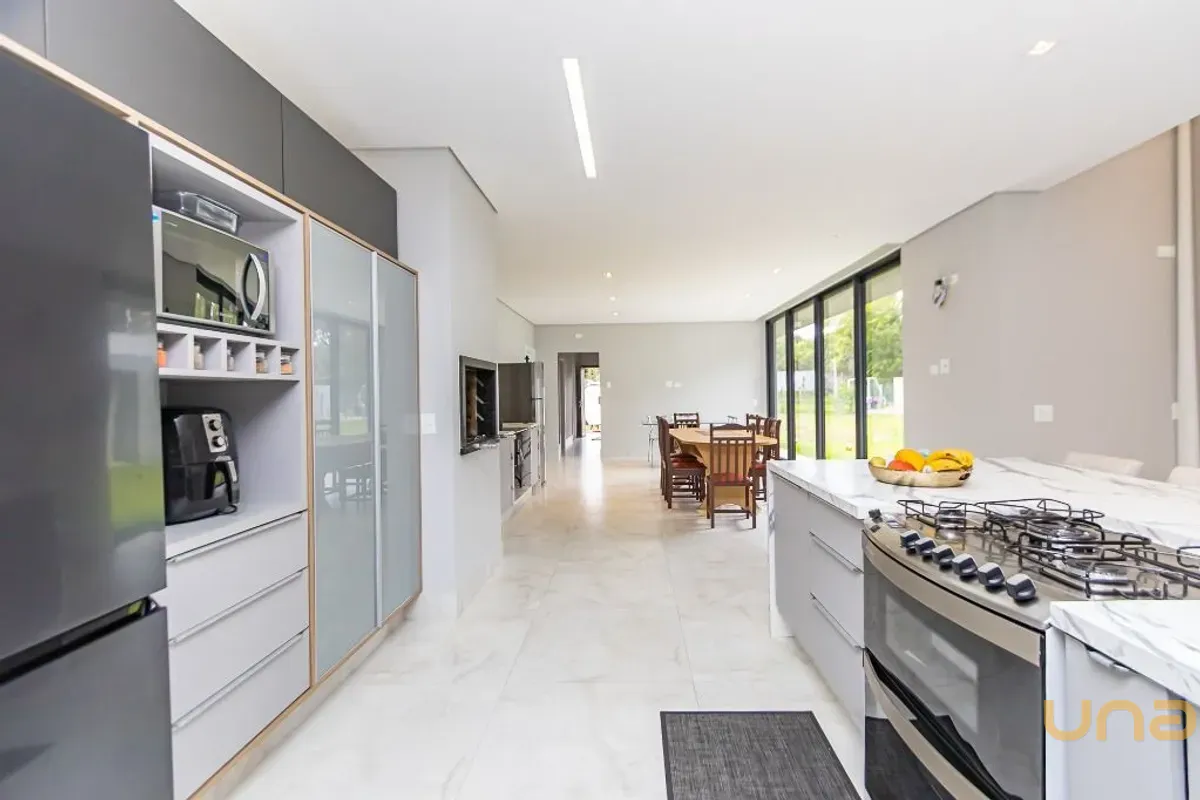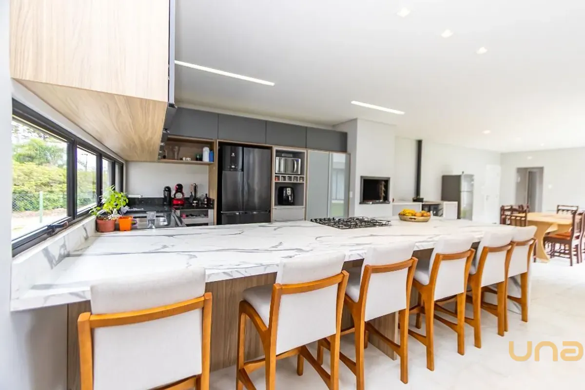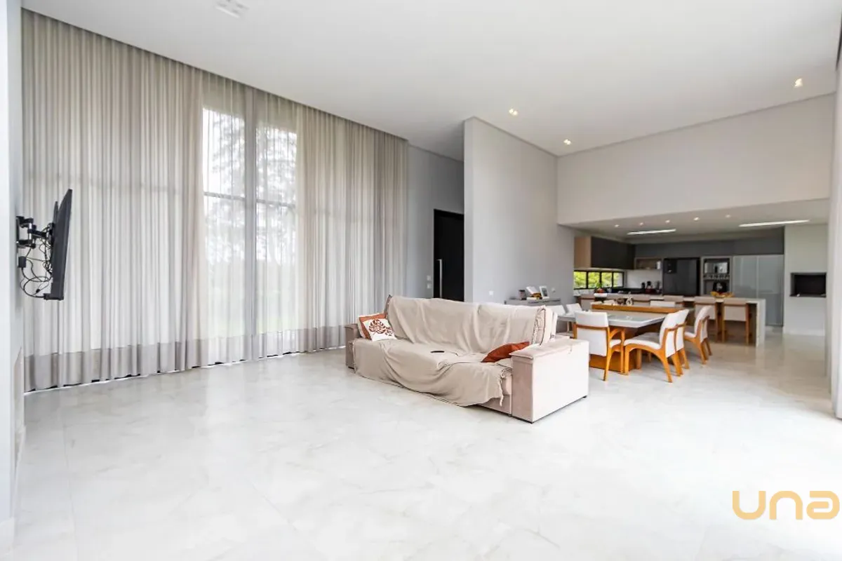 ** Ampla sala multi ambientes acessada através de enorme porta pivotante e hall. Tudo em pé direito duplo servida por grandes panos de vidro com visão para a frente da residência e, também, para a possível piscina, como consta em projeto e campo de futebol suíço, já disponível. Lareira e no lado oposto, área de jantar e cozinha integrada com churrasqueira e fogão a lenha. Na continuação, mais espaços para mesa de almoço e acesso a quarto de hospedes, depósito, área de lavanderia e conjunto de lavabo, ducha/vestiário e BWC que podem atender à futura piscina.