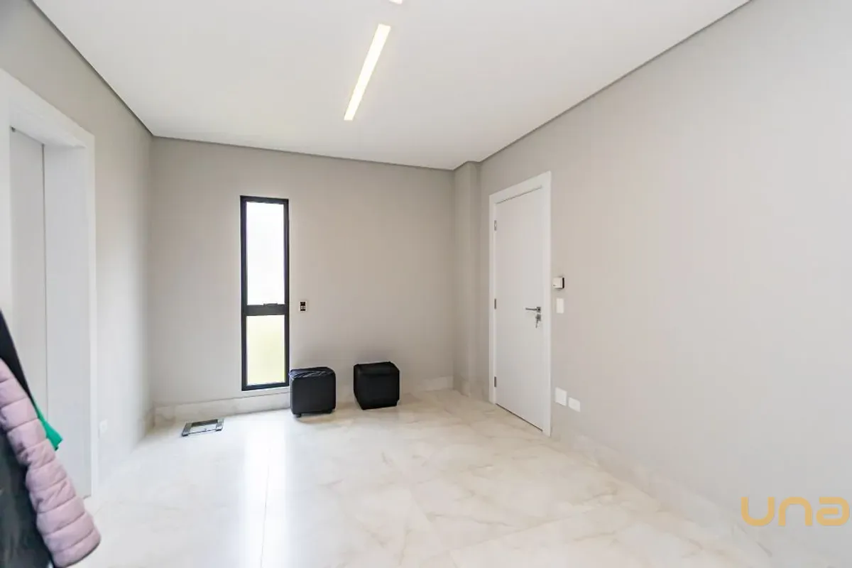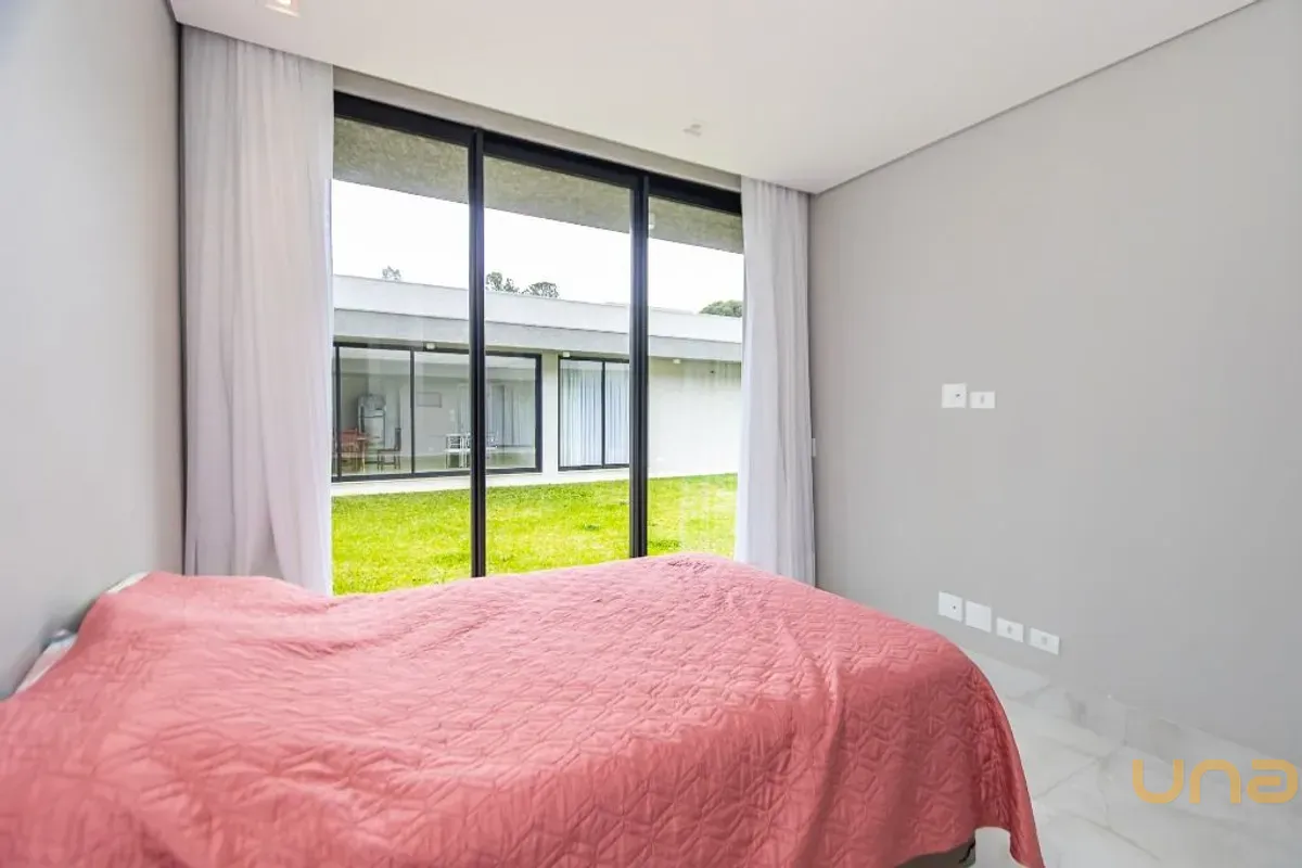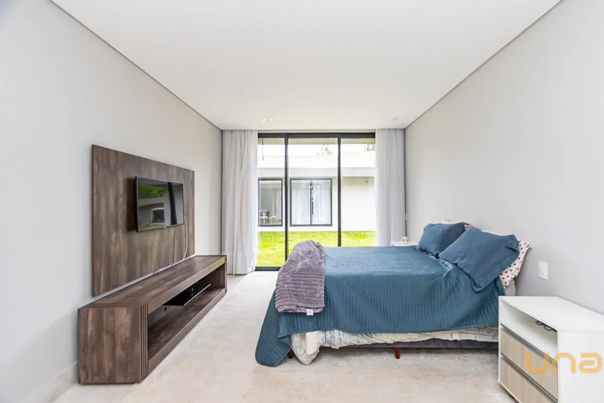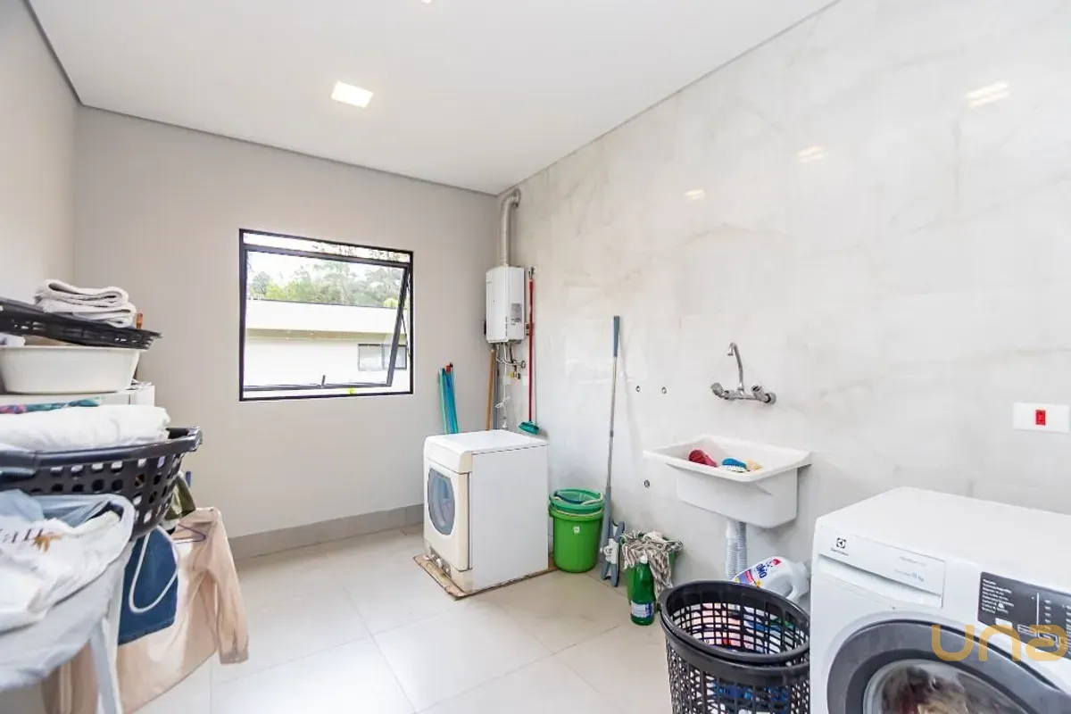 ** Ampla sala multi ambientes acessada através de enorme porta pivotante e hall. Tudo em pé direito duplo servida por grandes panos de vidro com visão para a frente da residência e, também, para a possível piscina, como consta em projeto e campo de futebol suíço, já disponível. Lareira e no lado oposto, área de jantar e cozinha integrada com churrasqueira e fogão a lenha. Na continuação, mais espaços para mesa de almoço e acesso a quarto de hospedes, depósito, área de lavanderia e conjunto de lavabo, ducha/vestiário e BWC que podem atender à futura piscina.