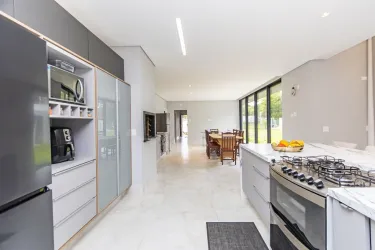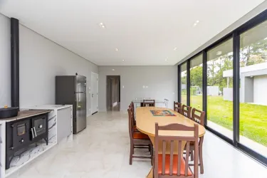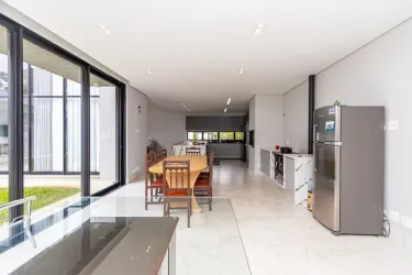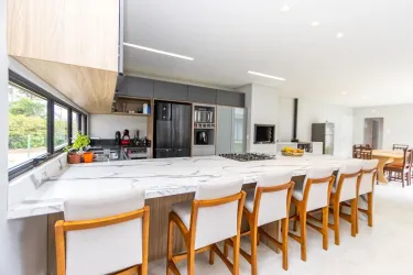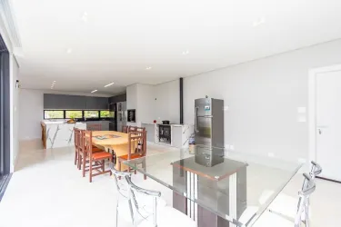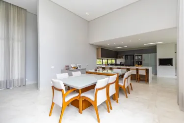 ** Ampla sala multi ambientes acessada através de enorme porta pivotante e hall. Tudo em pé direito duplo servida por grandes panos de vidro com visão para a frente da residência e, também, para a possível piscina, como consta em projeto e campo de futebol suíço, já disponível. Lareira e no lado oposto, área de jantar e cozinha integrada com churrasqueira e fogão a lenha. Na continuação, mais espaços para mesa de almoço e acesso a quarto de hospedes, depósito, área de lavanderia e conjunto de lavabo, ducha/vestiário e BWC que podem atender à futura piscina.